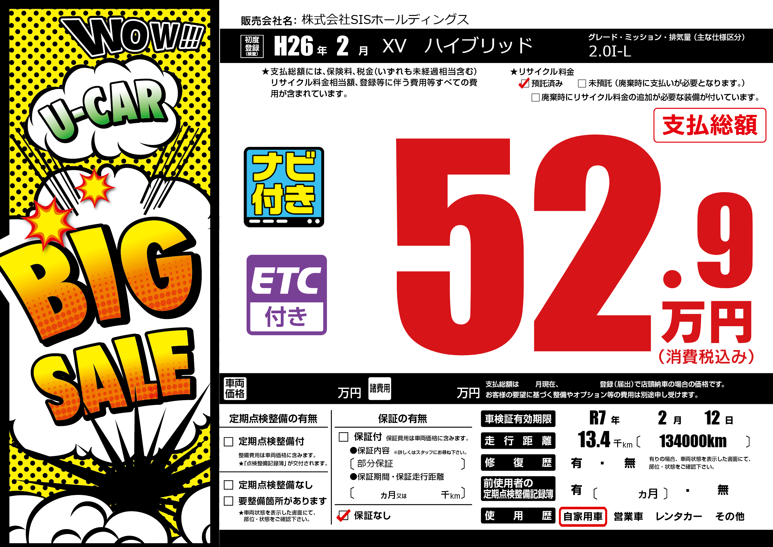 | 走行キロ | 1.3万km | 初年度登録 | H26年2月 |