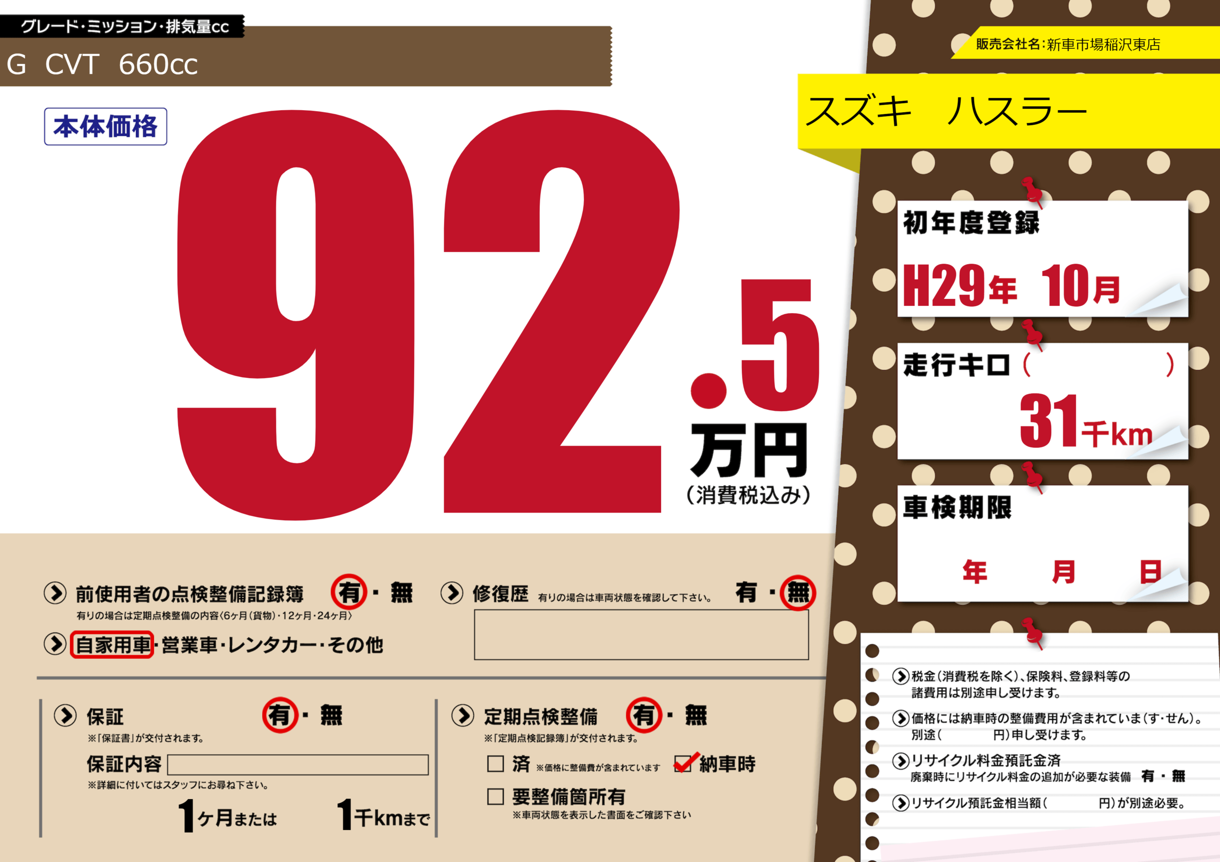 | 車名 | スズキ ハスラー | グレード ミッション 排気量 |