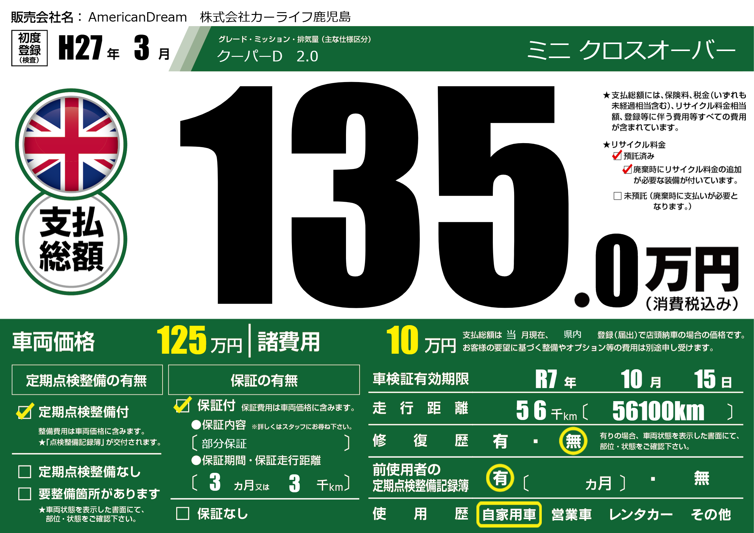 | 車名 | ミニ クロスオーバー | グレード ミッション 排気量 |