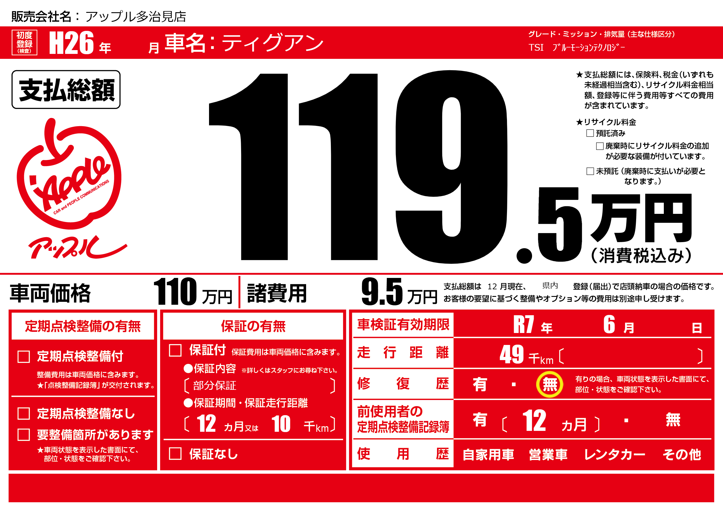 | 走行キロ | 4.9万km | 初年度登録 | H26年---月 |