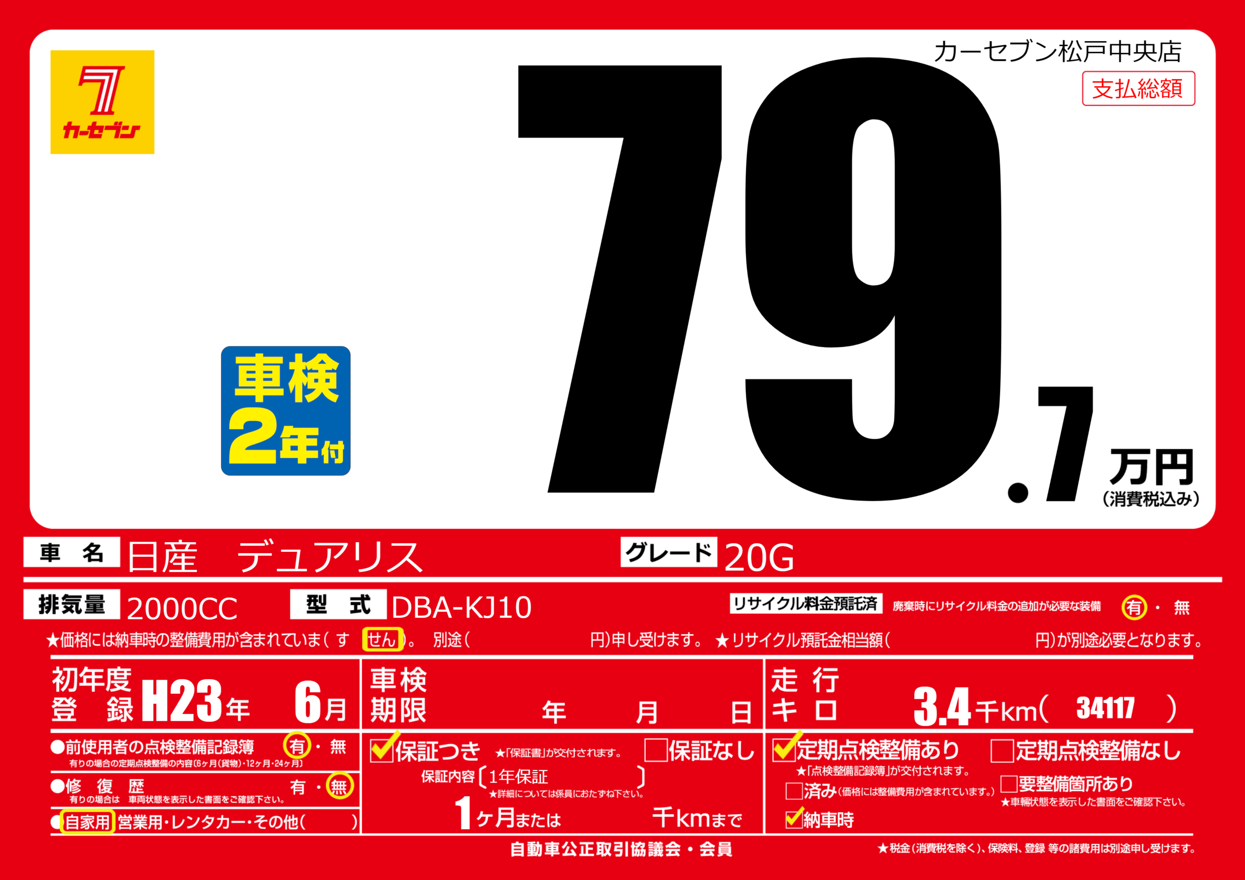 | 車名 | 日産 デュアリス | グレード ミッション 排気量 |