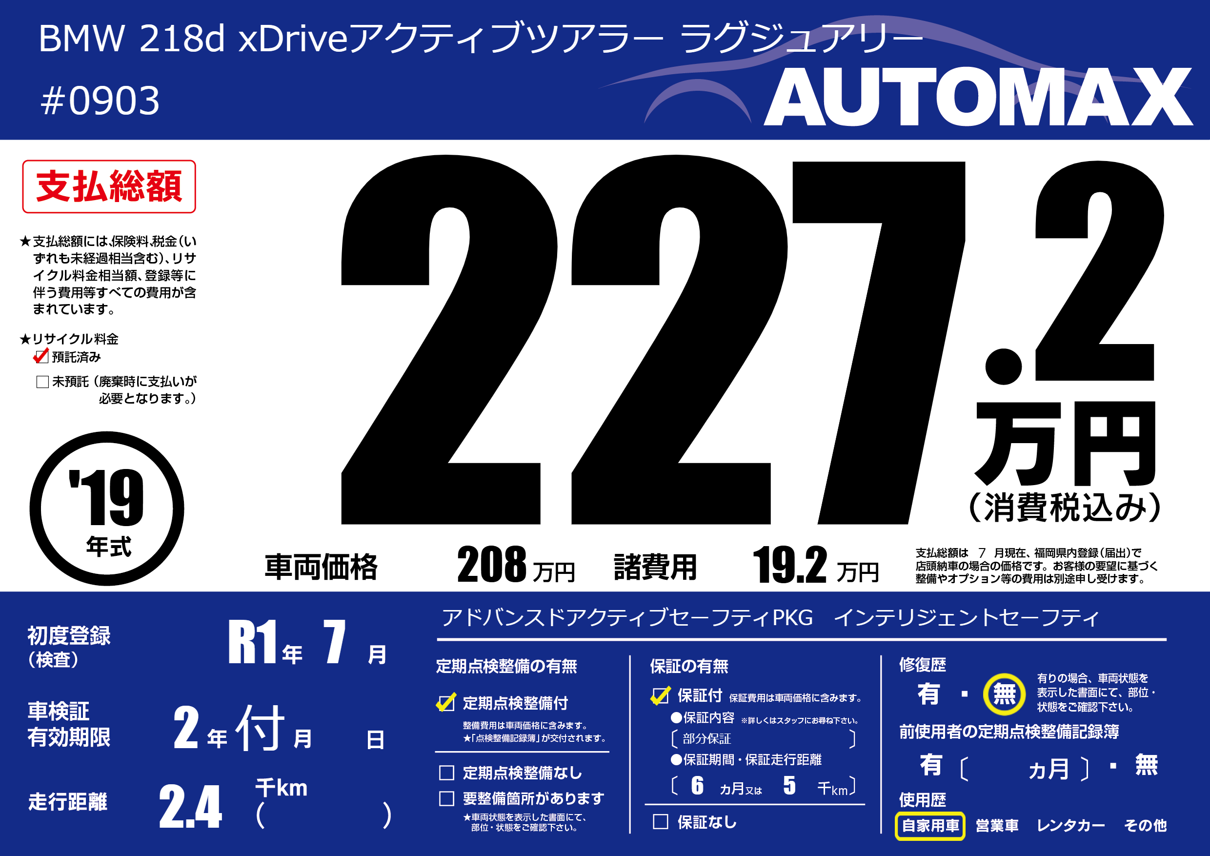 | 車名 | BMW 218d xDriveアクティブツアラー ラグジュアリー | グレード ミッション 排気量 |