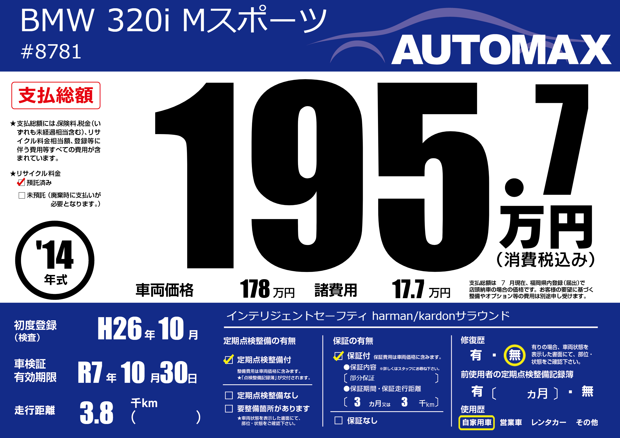 | 車名 | BMW 320i Mスポーツ | グレード ミッション 排気量 |