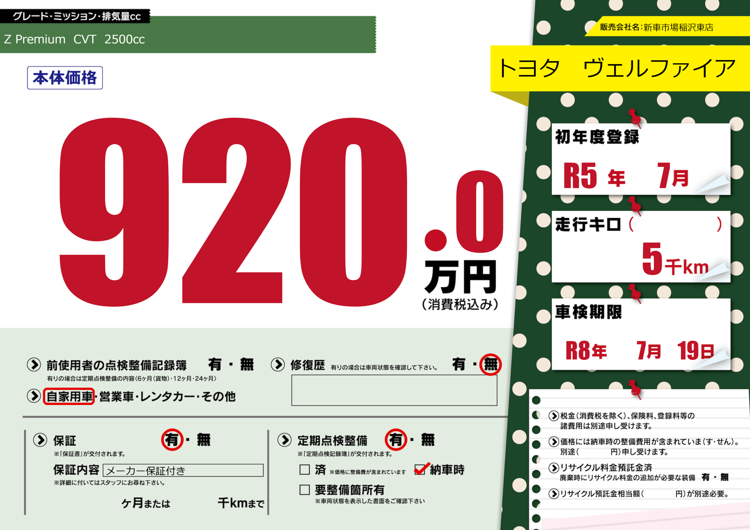 保証付き 保証内容(メーカー保証付き) ---ヶ月または()千kmまで |