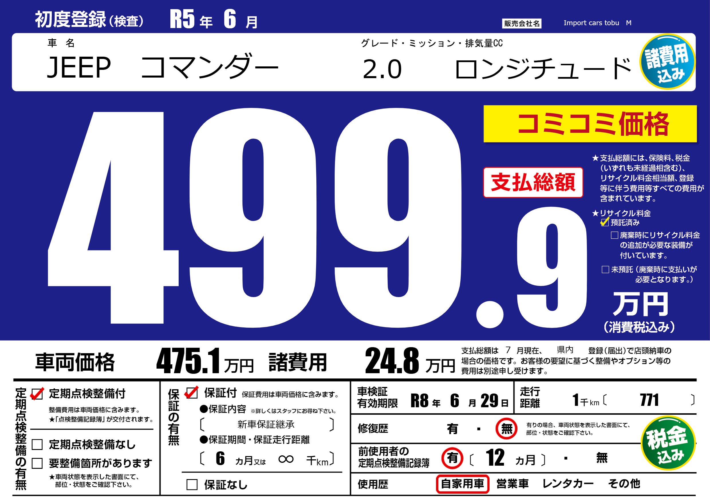 | 車検制限 | R8年 6月 29日 | ||