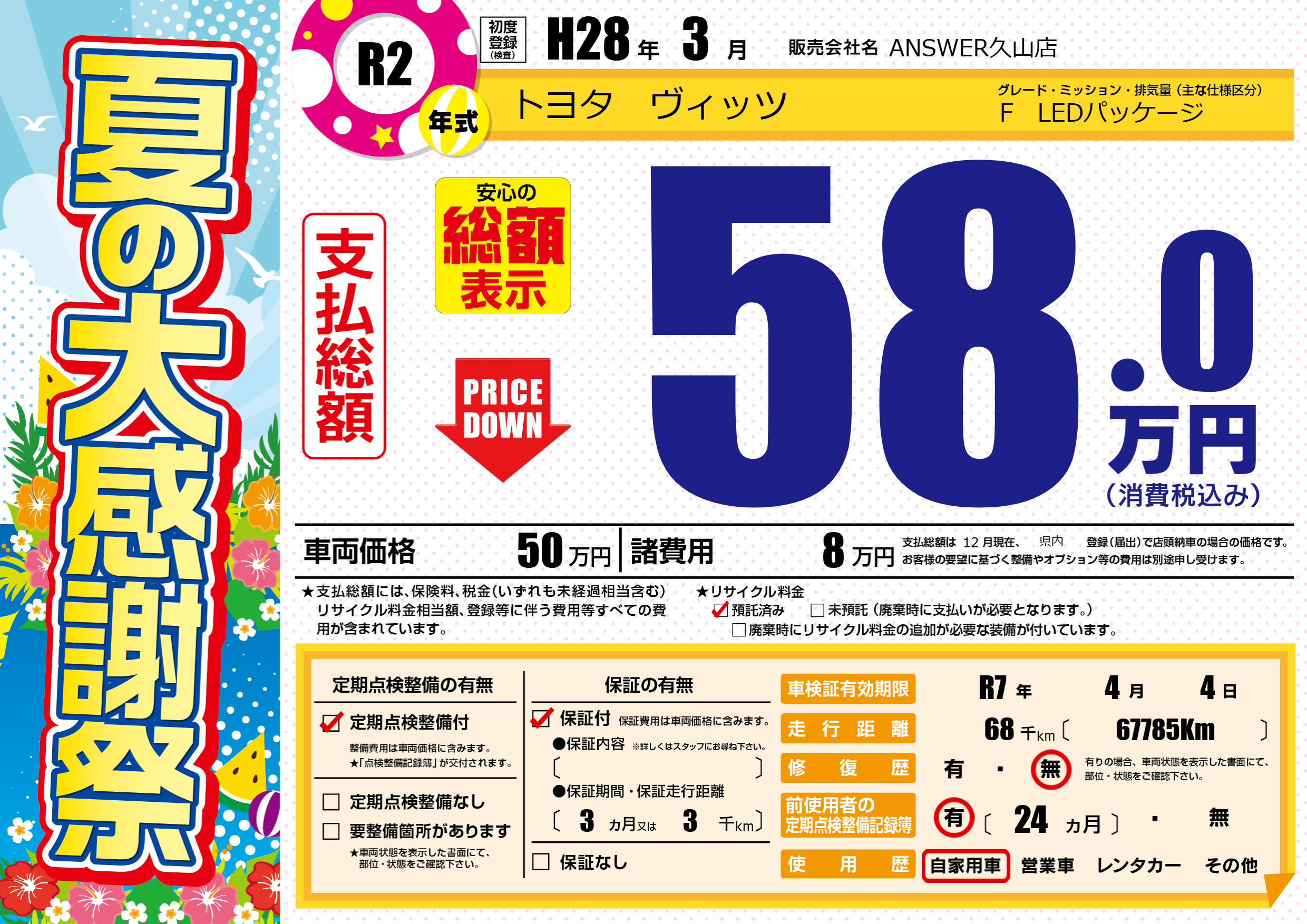 | 走行キロ | 6.8万km | 初年度登録 | H28年3月 |