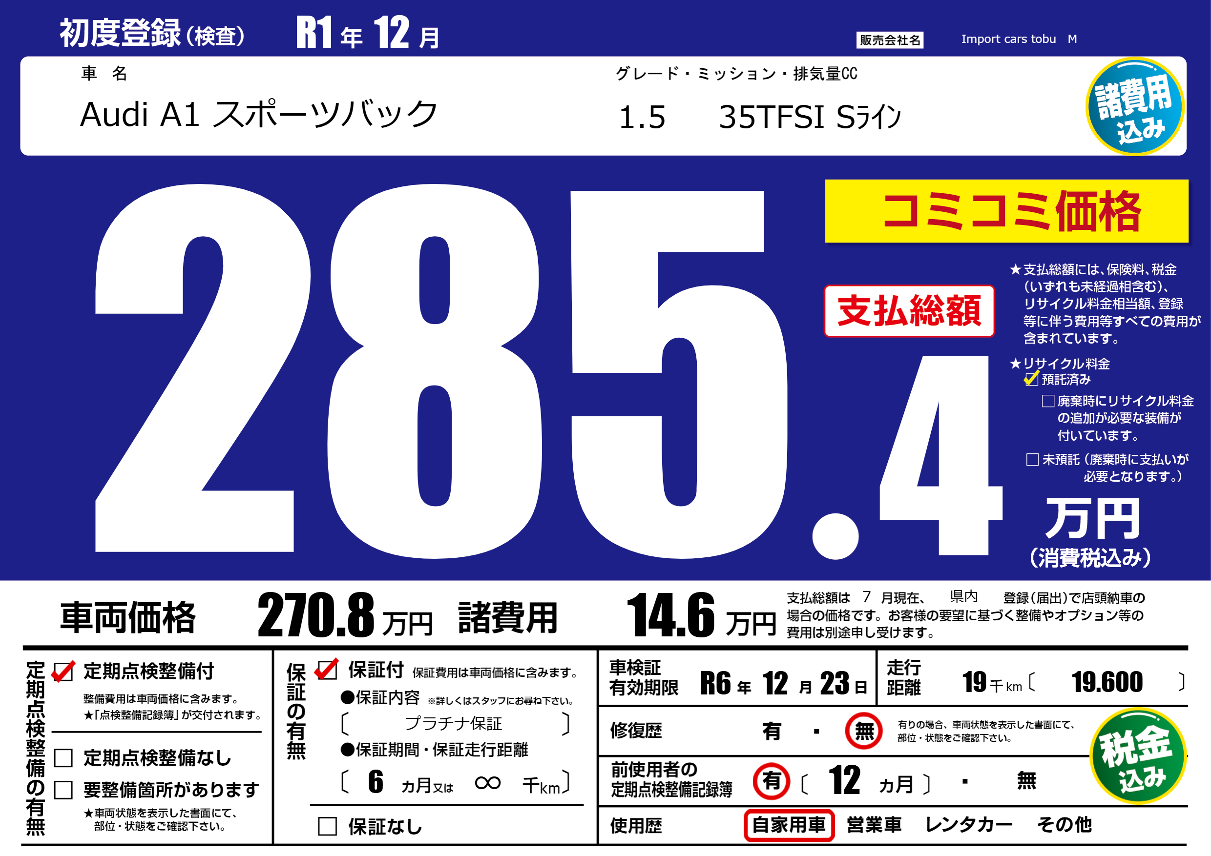 | 車名 | Audi A1 スポーツバック | グレード ミッション 排気量 |