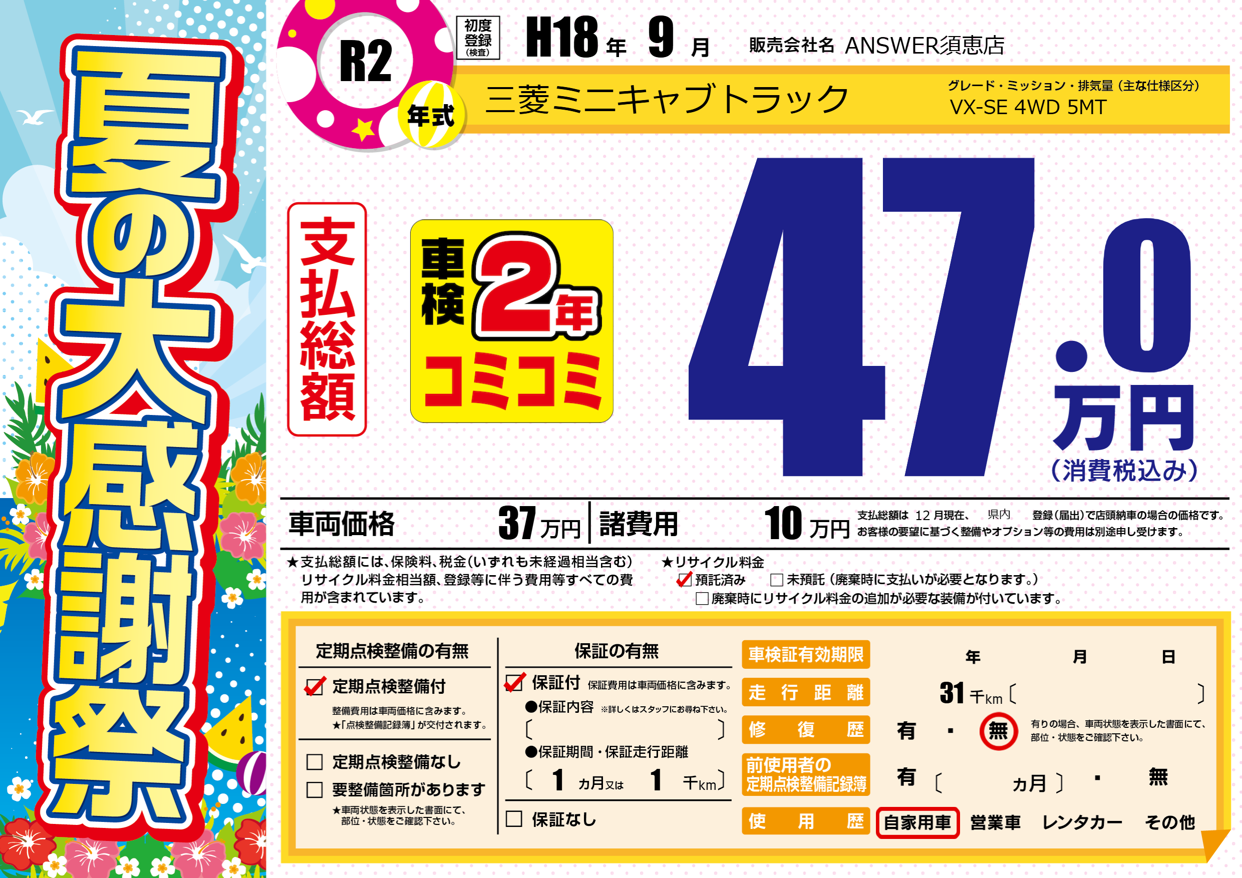 保証付き 保証内容(---) 1ヶ月または(1)千kmまで |