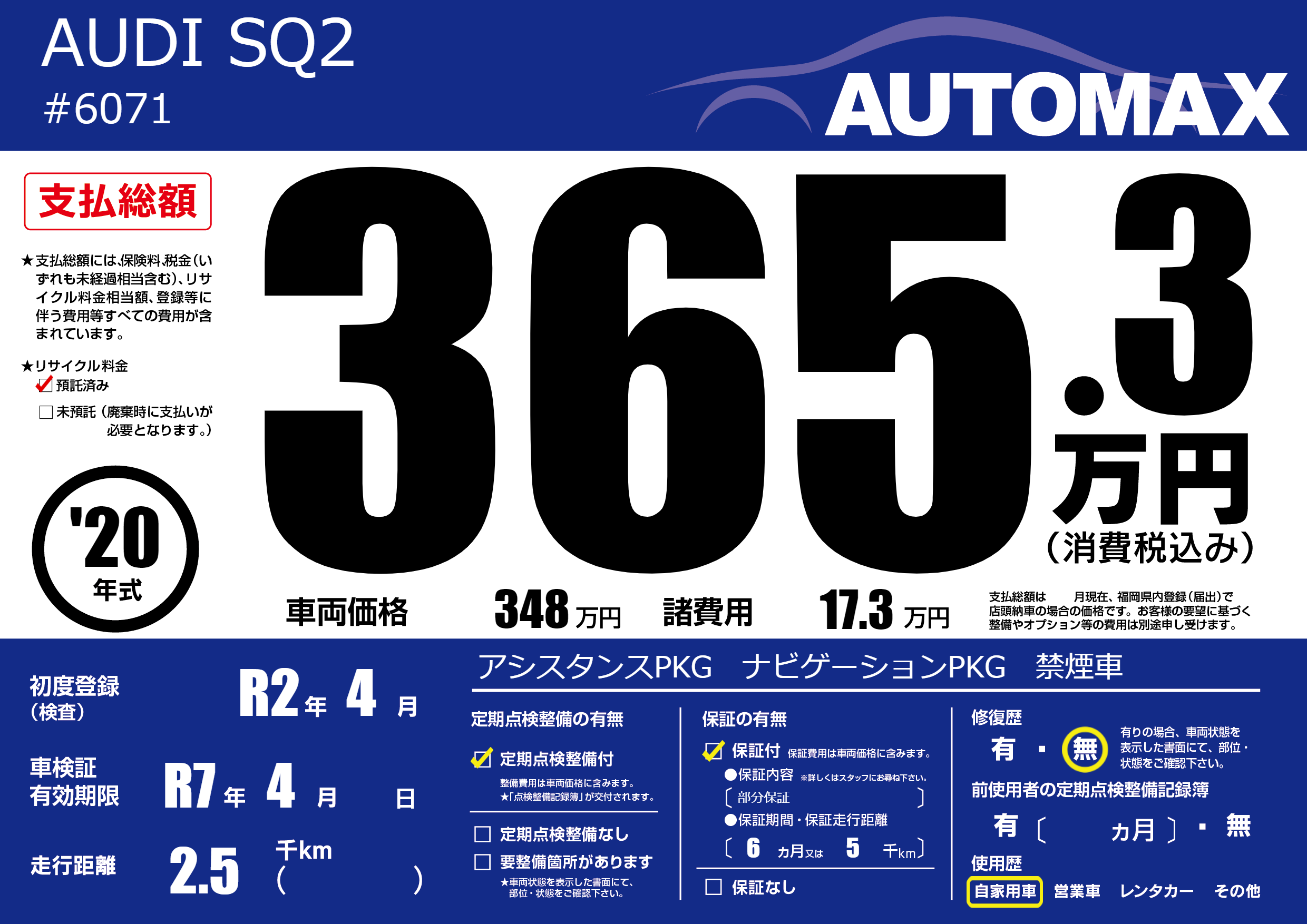| 車検制限 | R7年 4月 - 日 | ||
