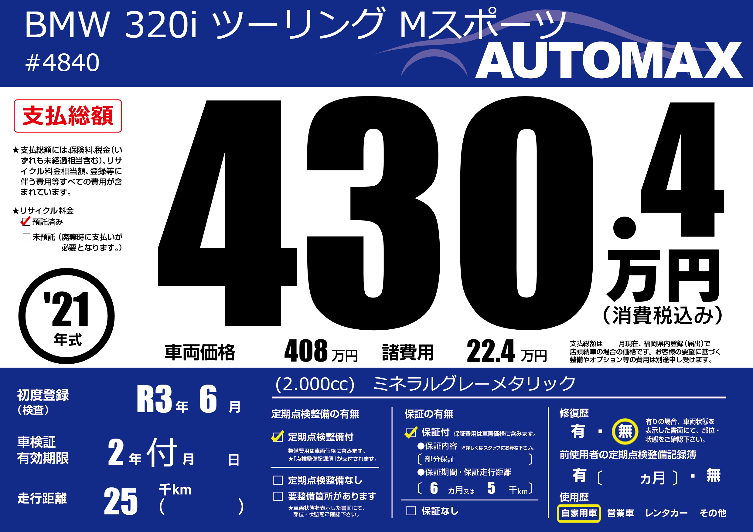 | 車名 | BMW 320i ツーリング Mスポーツ | グレード ミッション 排気量 |