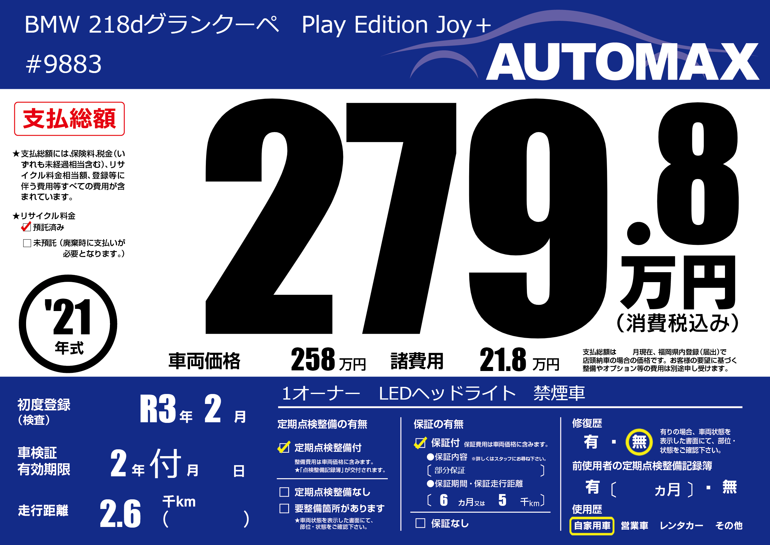 | 車名 | BMW 218dグランクーペ Play Edition Joy+ | グレード ミッション 排気量 |