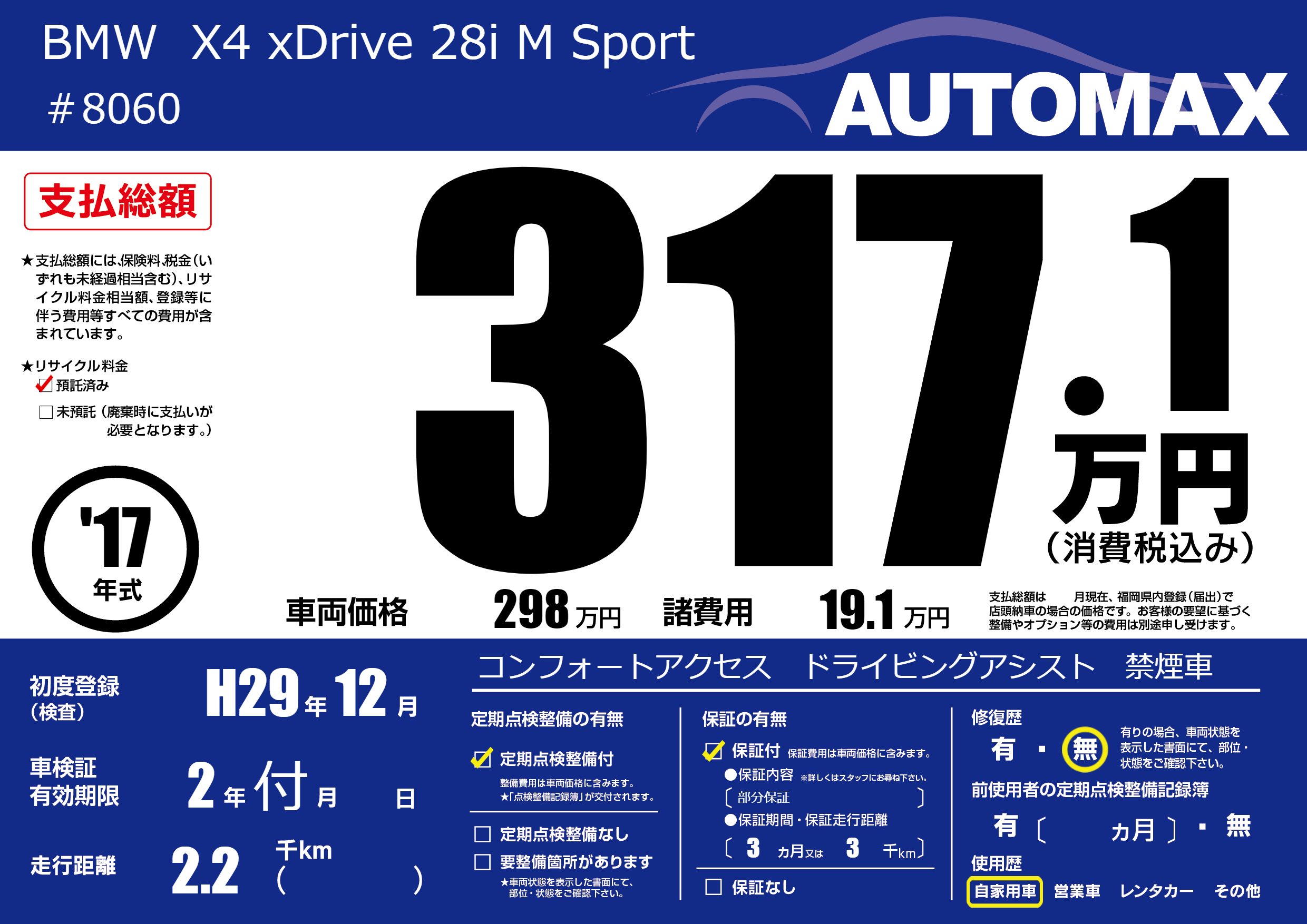 | 車名 | BMW X4 xDrive 28i M Sport | グレード ミッション 排気量 |