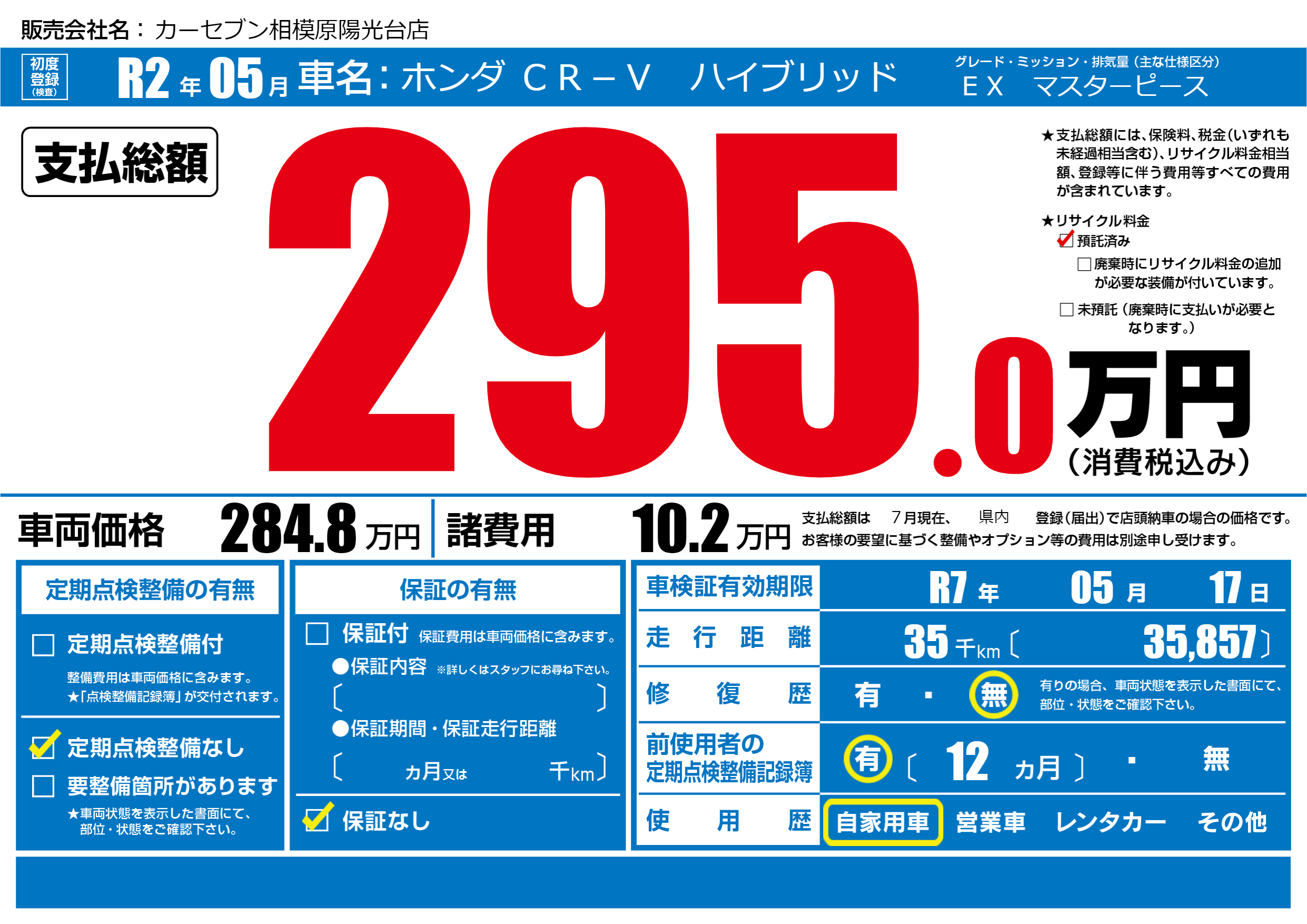 | 車名 | ホンダ CR-V ハイブリッド | グレード ミッション 排気量 |