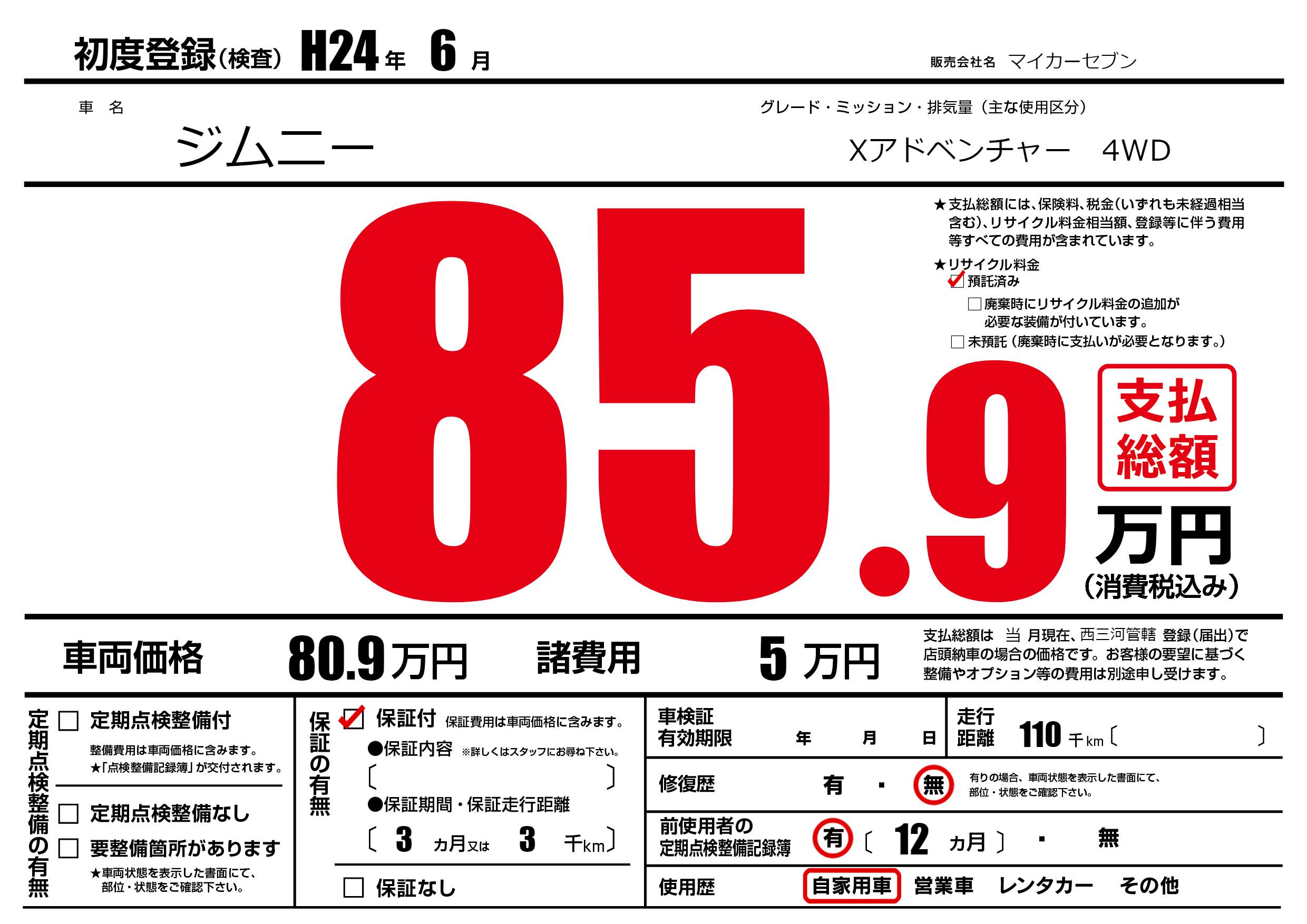 保証付き 保証内容(---) 3ヶ月または(3)千kmまで |