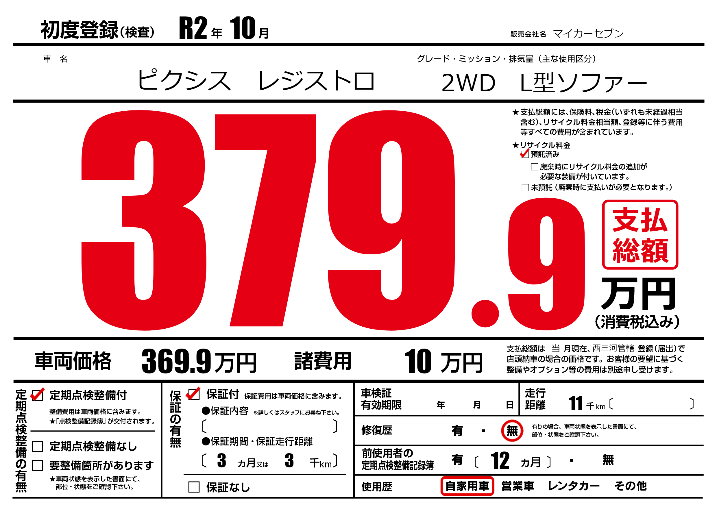 | 走行キロ | 1.1万km | 初年度登録 | R2年10月 |