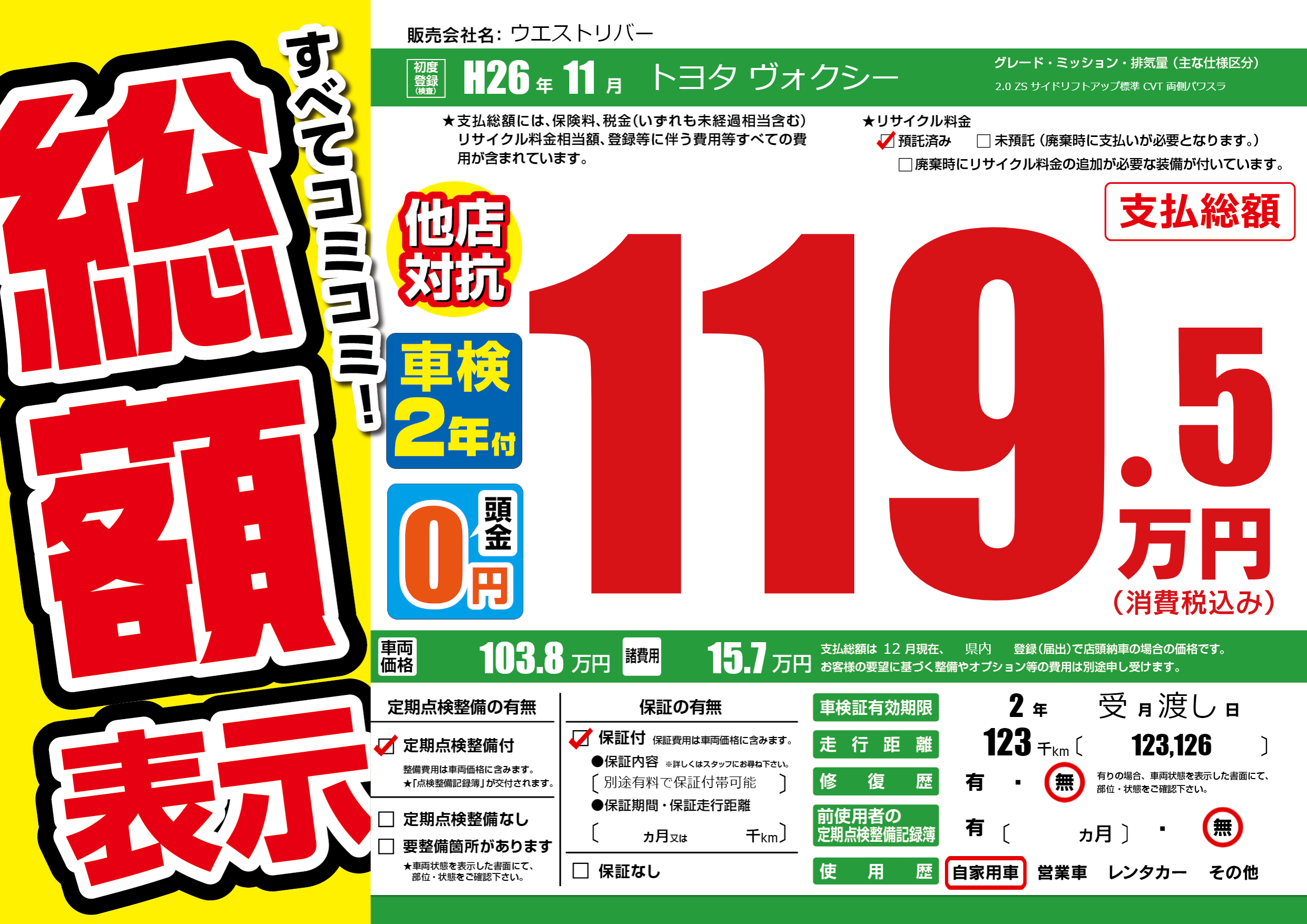 | 走行キロ | 12.3万km | 初年度登録 | H26年11月 |