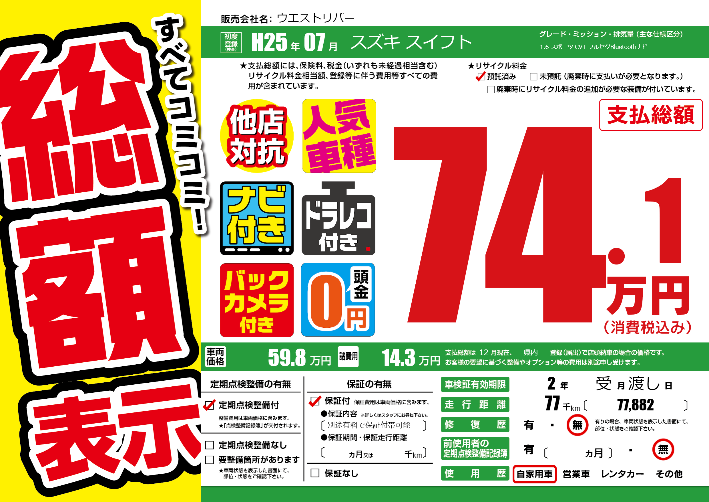 | 走行キロ | 7.7万km | 初年度登録 | H25年07月 |