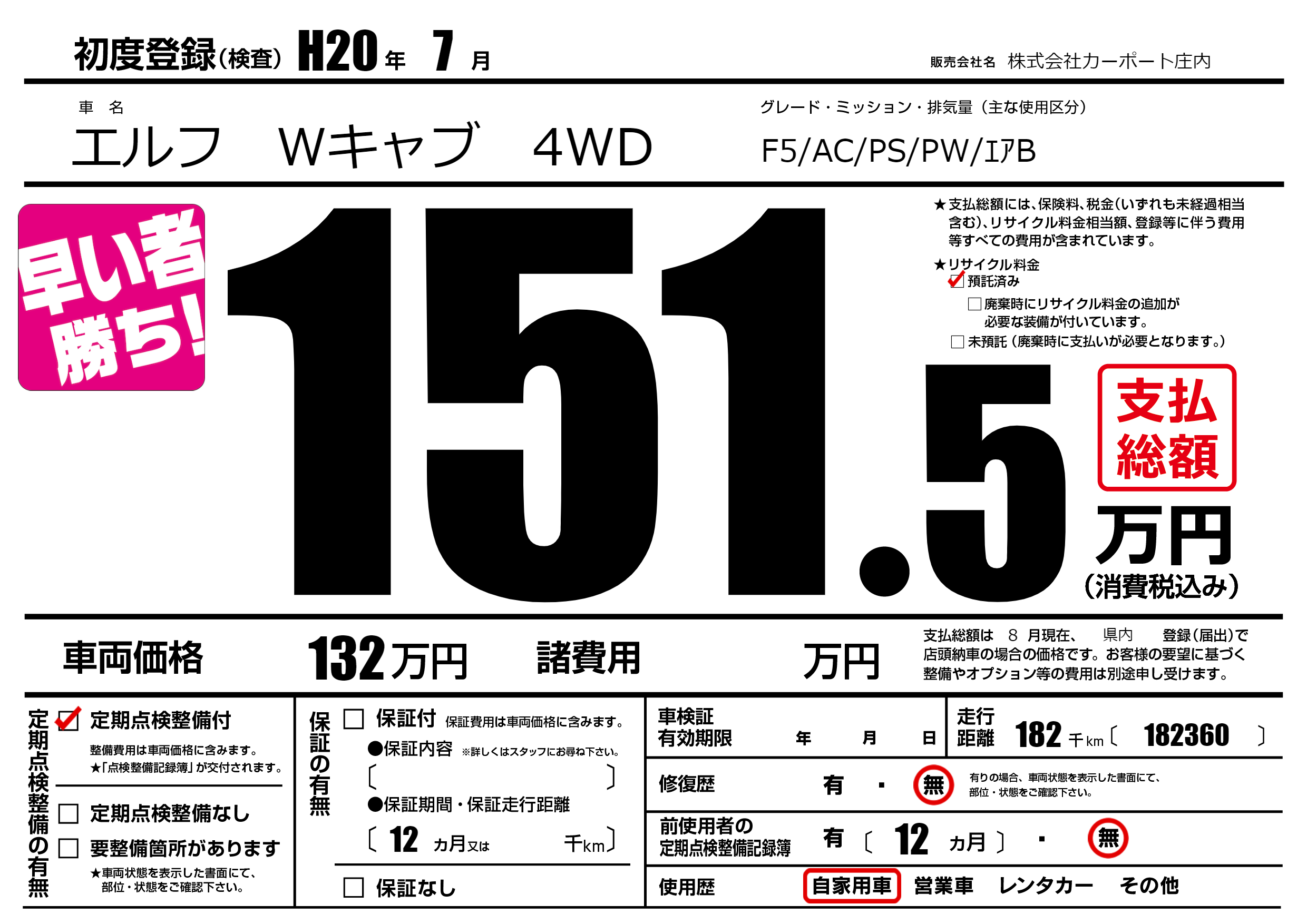 | 走行キロ | 18.2万km | 初年度登録 | H20年7月 |