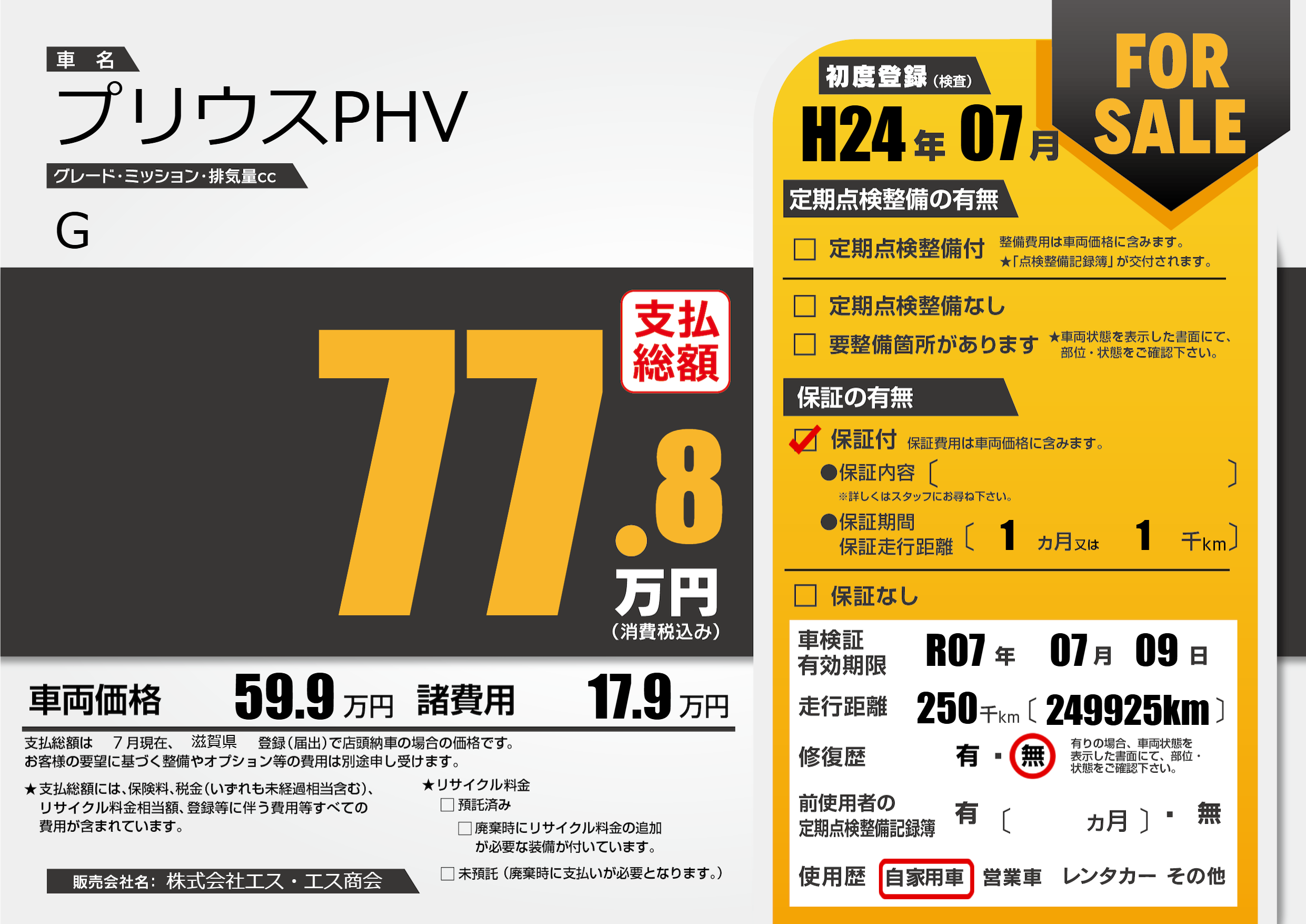 | 車名 | プリウスPHV | グレード ミッション 排気量 |