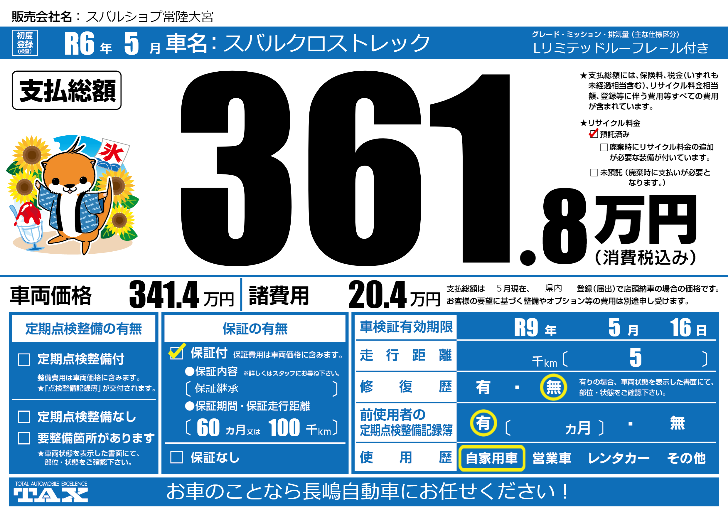 保証付き 保証内容(保証継承) 60ヶ月または(100)千kmまで |