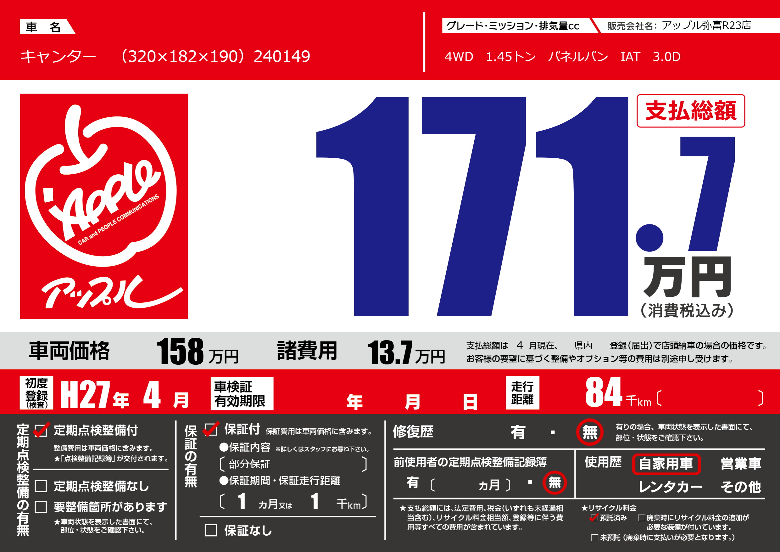 | 車名 | キャンター (320×182×190)240149 | グレード ミッション 排気量 |