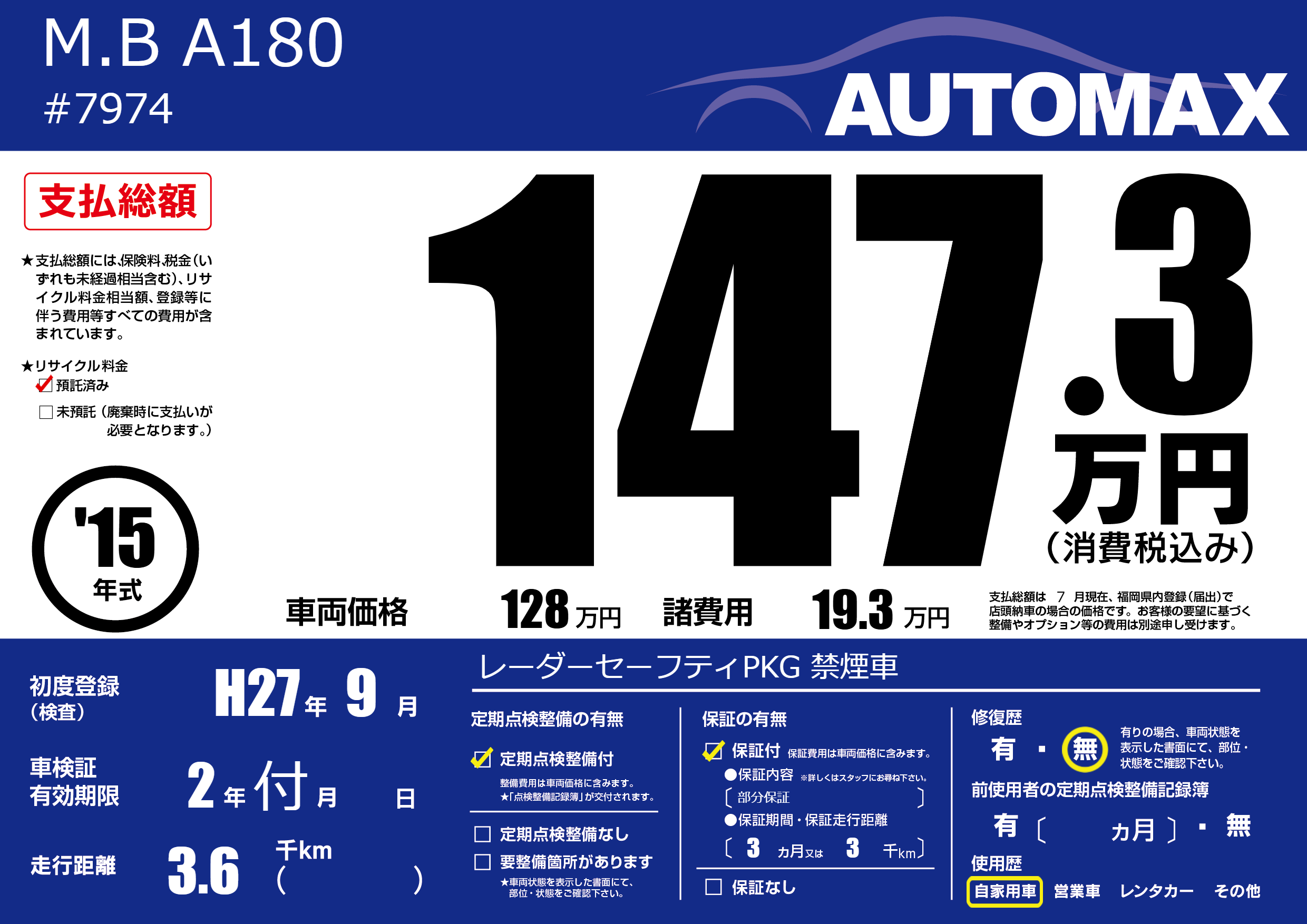 | 車名 | M.B A180 | グレード ミッション 排気量 |