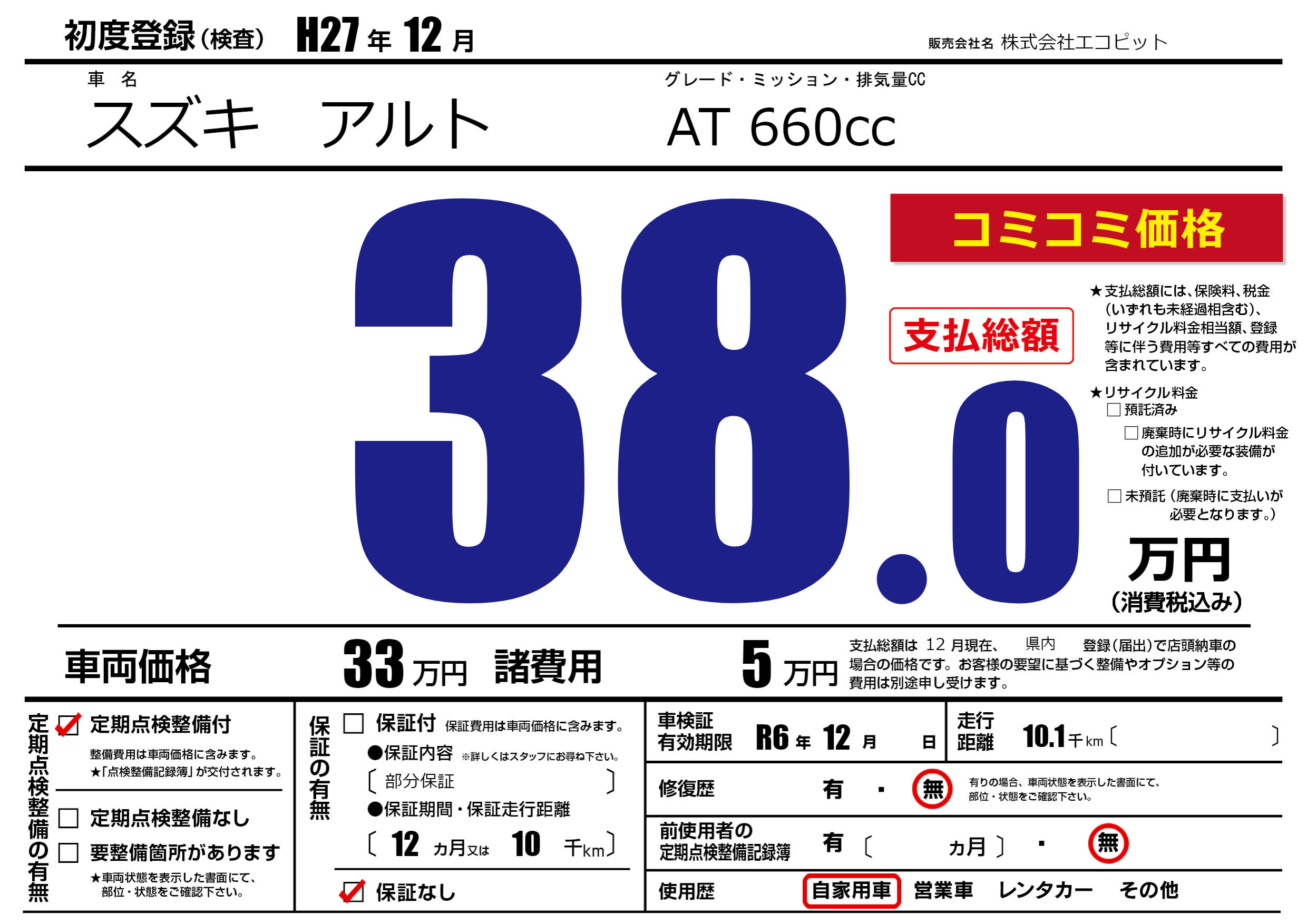 | 車名 | スズキ アルト | グレード ミッション 排気量 |