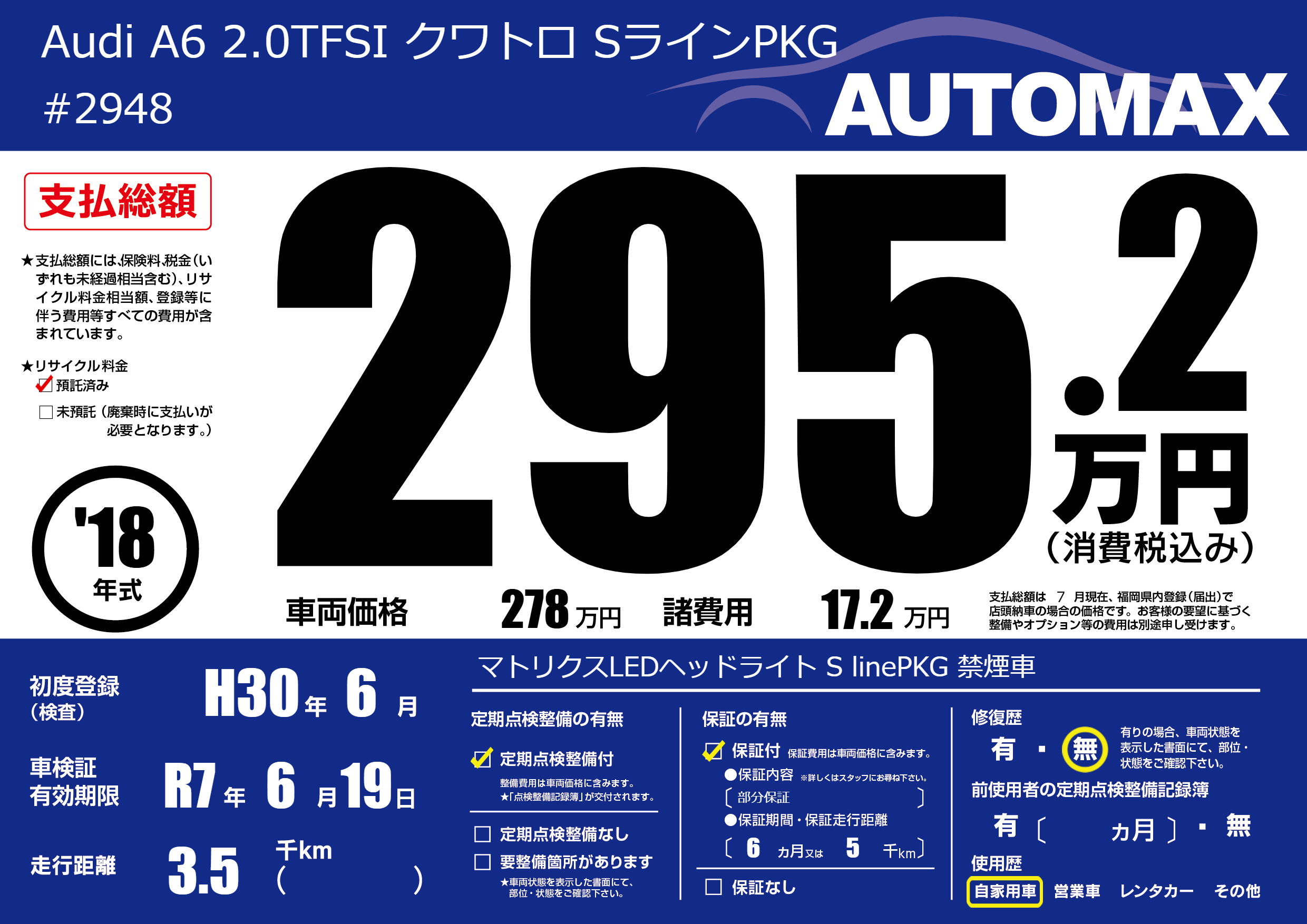 | 車名 | Audi A6 2.0TFSI クワトロ SラインPKG | グレード ミッション 排気量 |