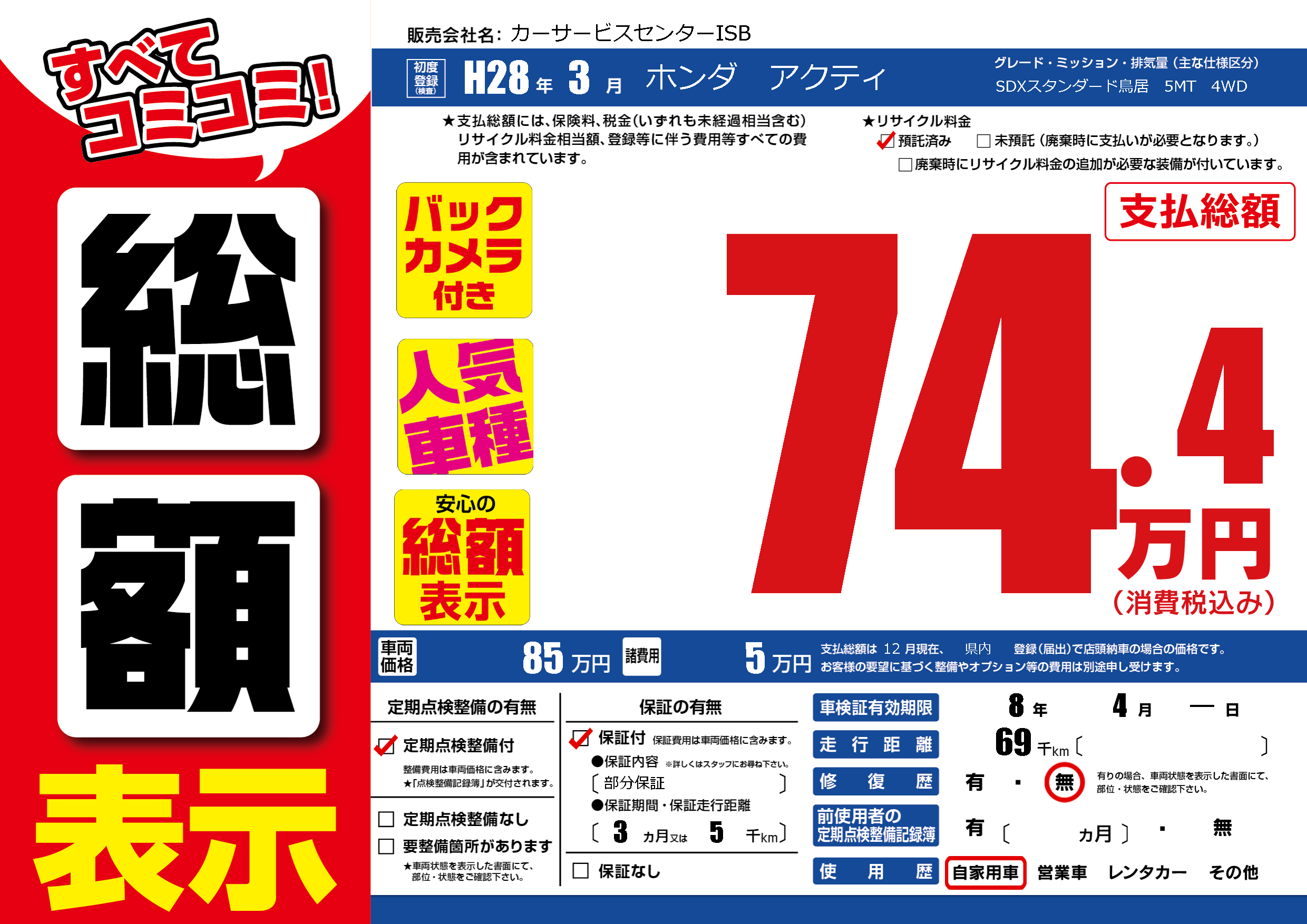 | 車名 | ホンダ アクティ | グレード ミッション 排気量 |