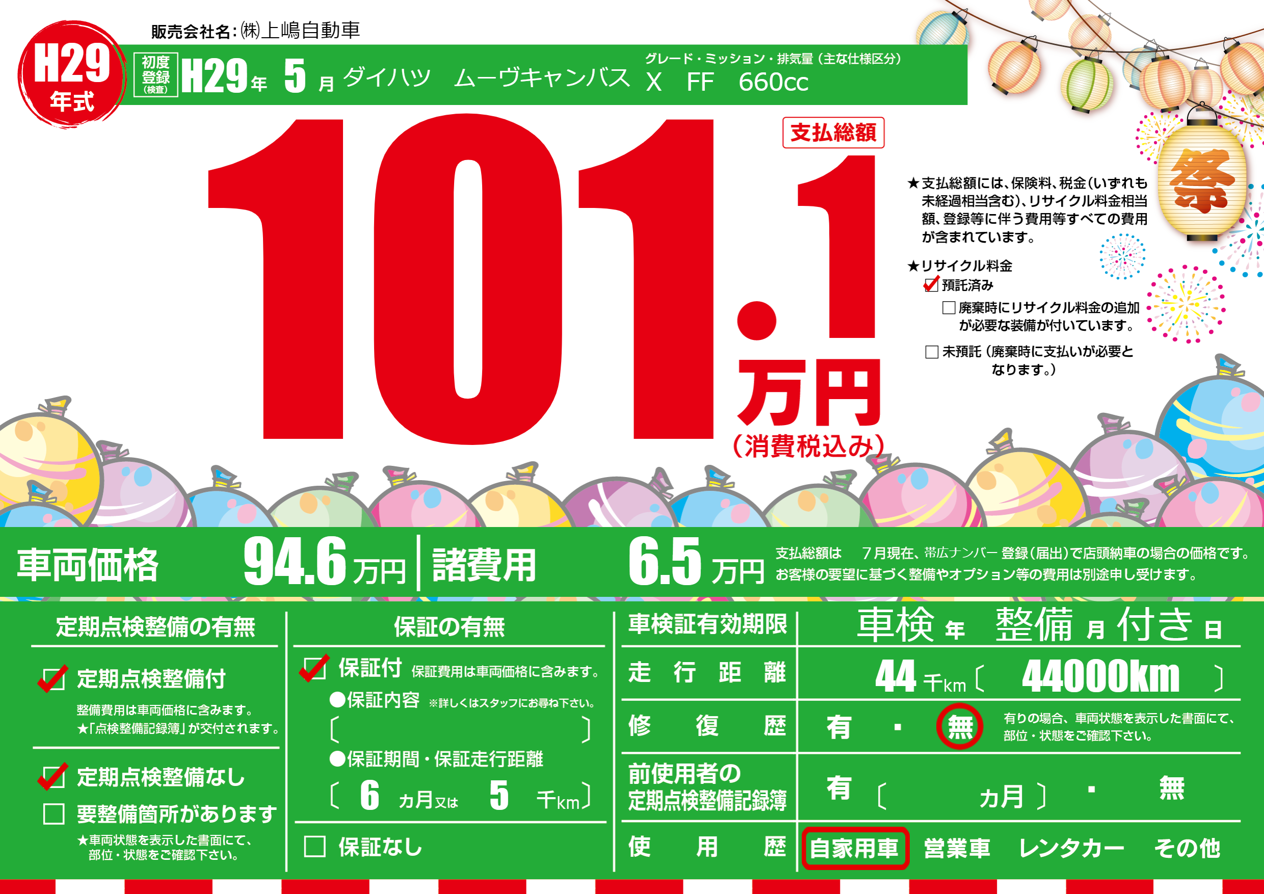| 車名 | ダイハツ ムーヴキャンバス | グレード ミッション 排気量 |
