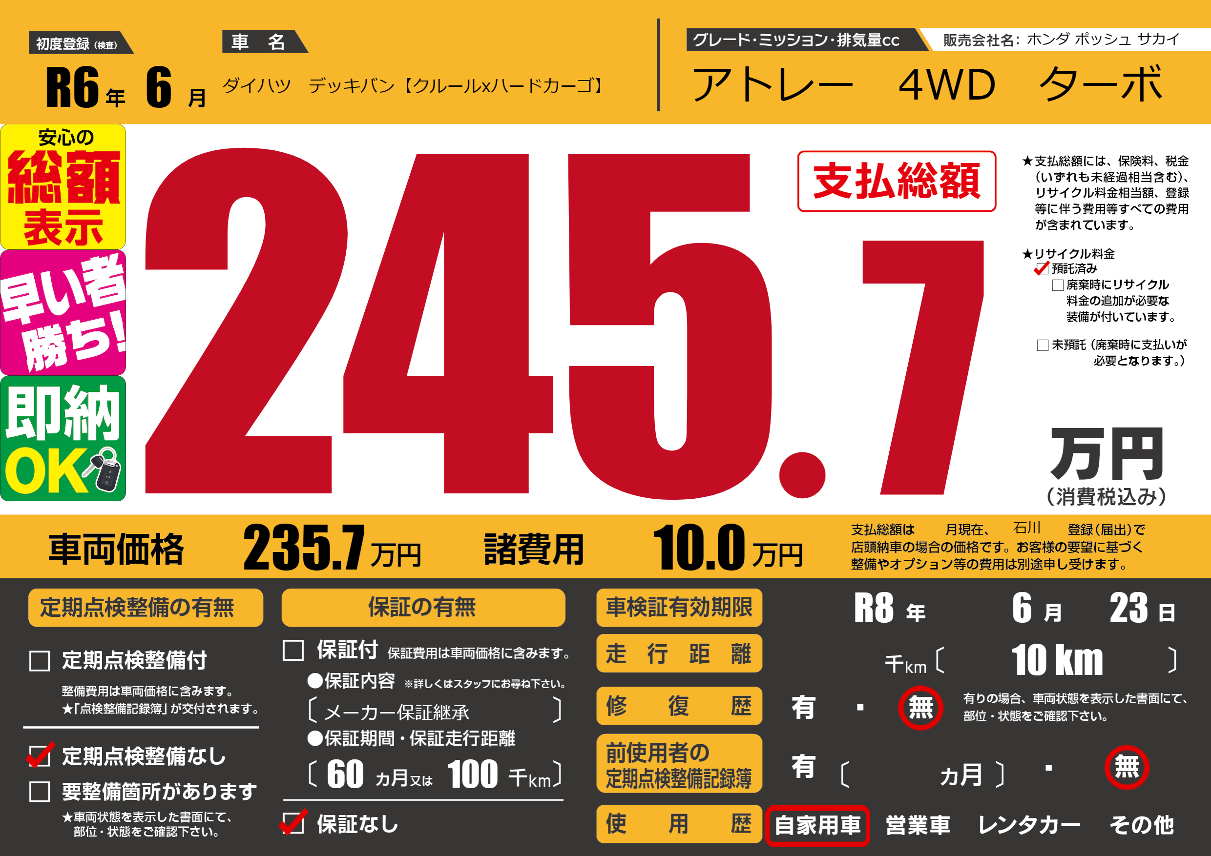 | 走行キロ | - | 初年度登録 | R6年6月 |
