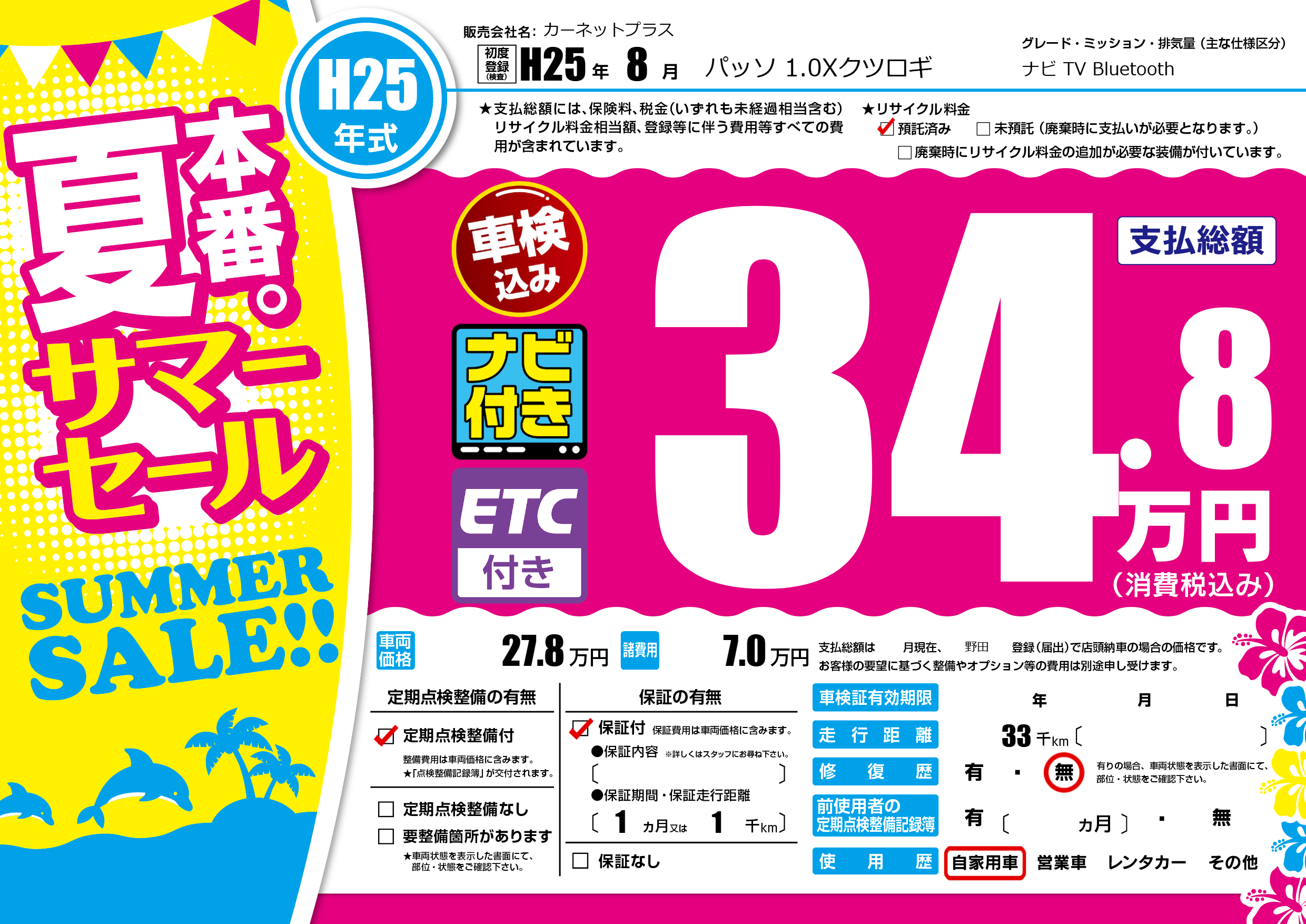 | 走行キロ | 3.3万km | 初年度登録 | H25年8月 |