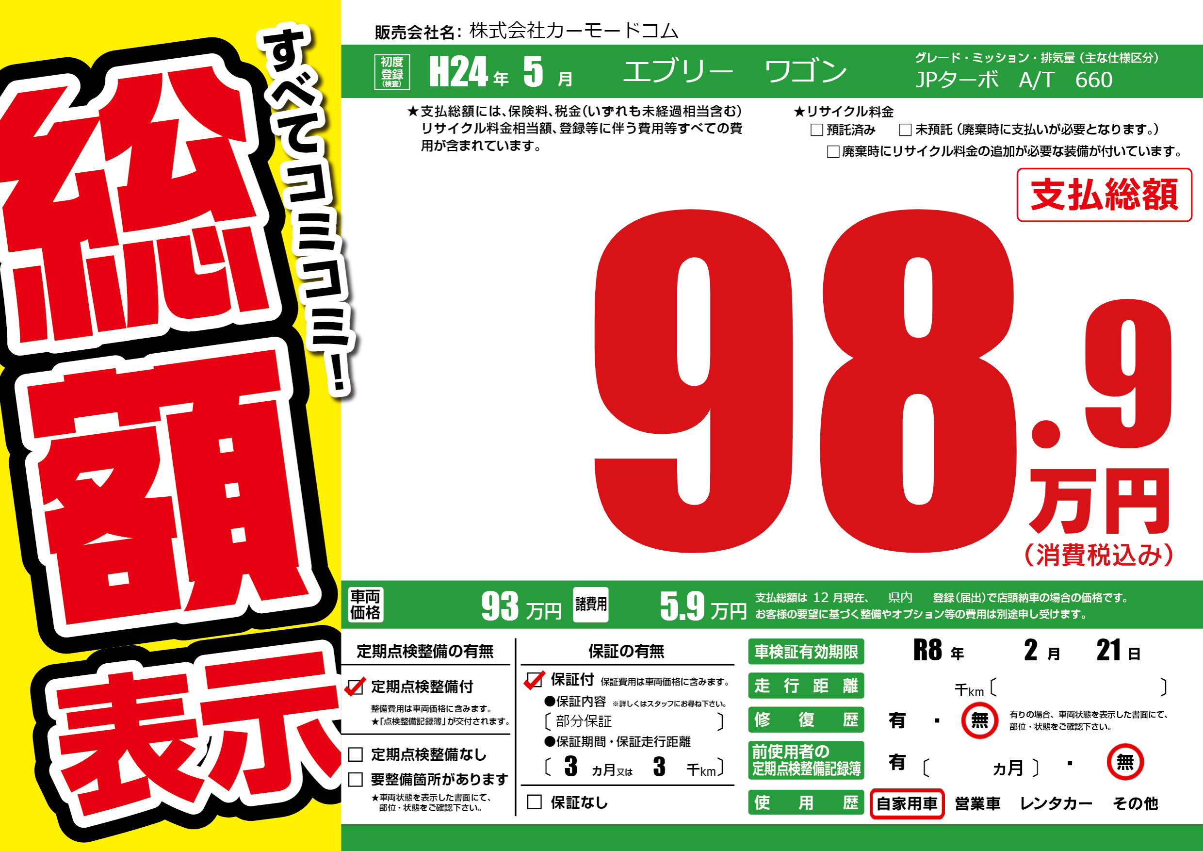 | 車名 | エブリー ワゴン | グレード ミッション 排気量 |