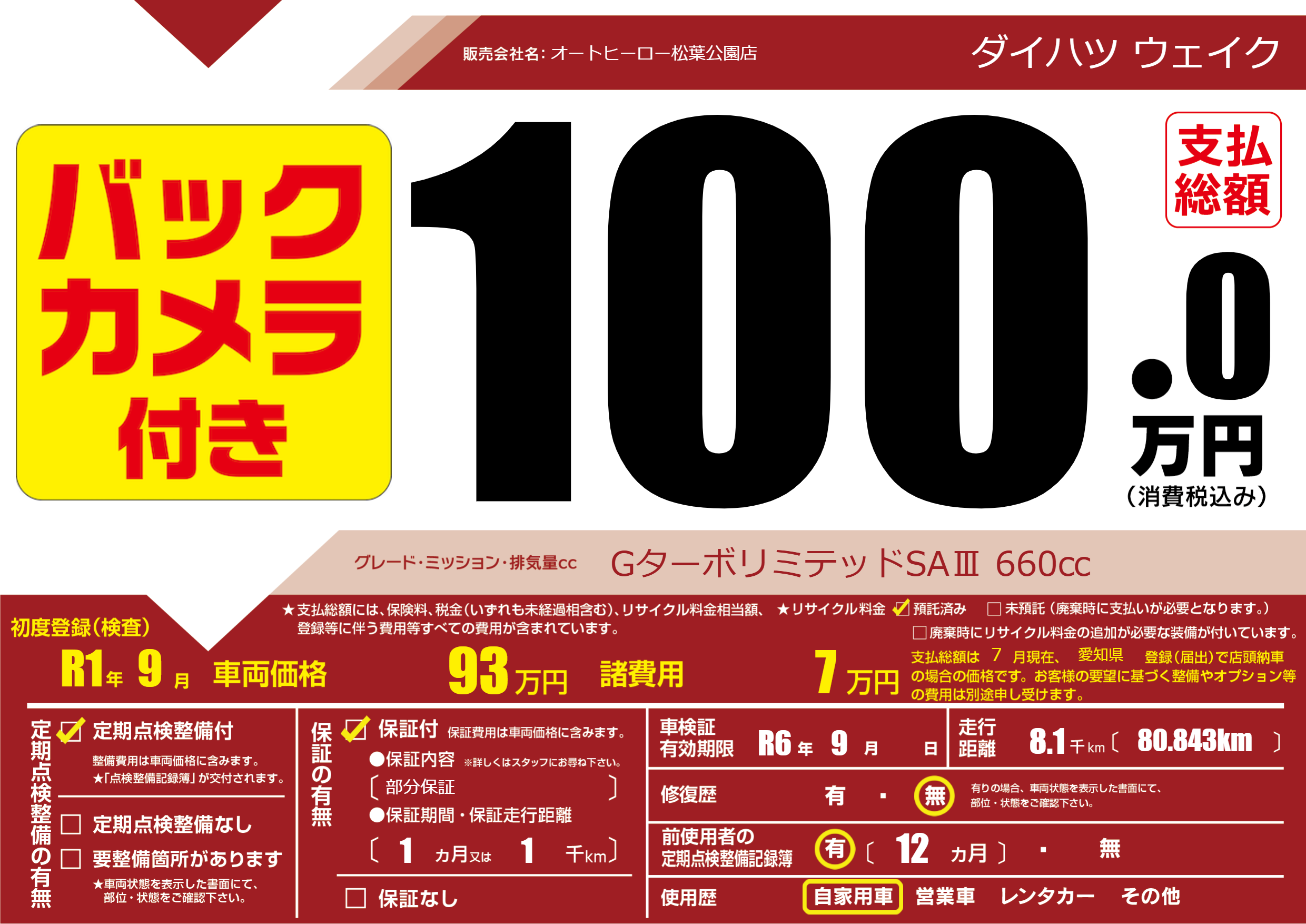 | 車名 | ダイハツ ウェイク | グレード ミッション 排気量 |