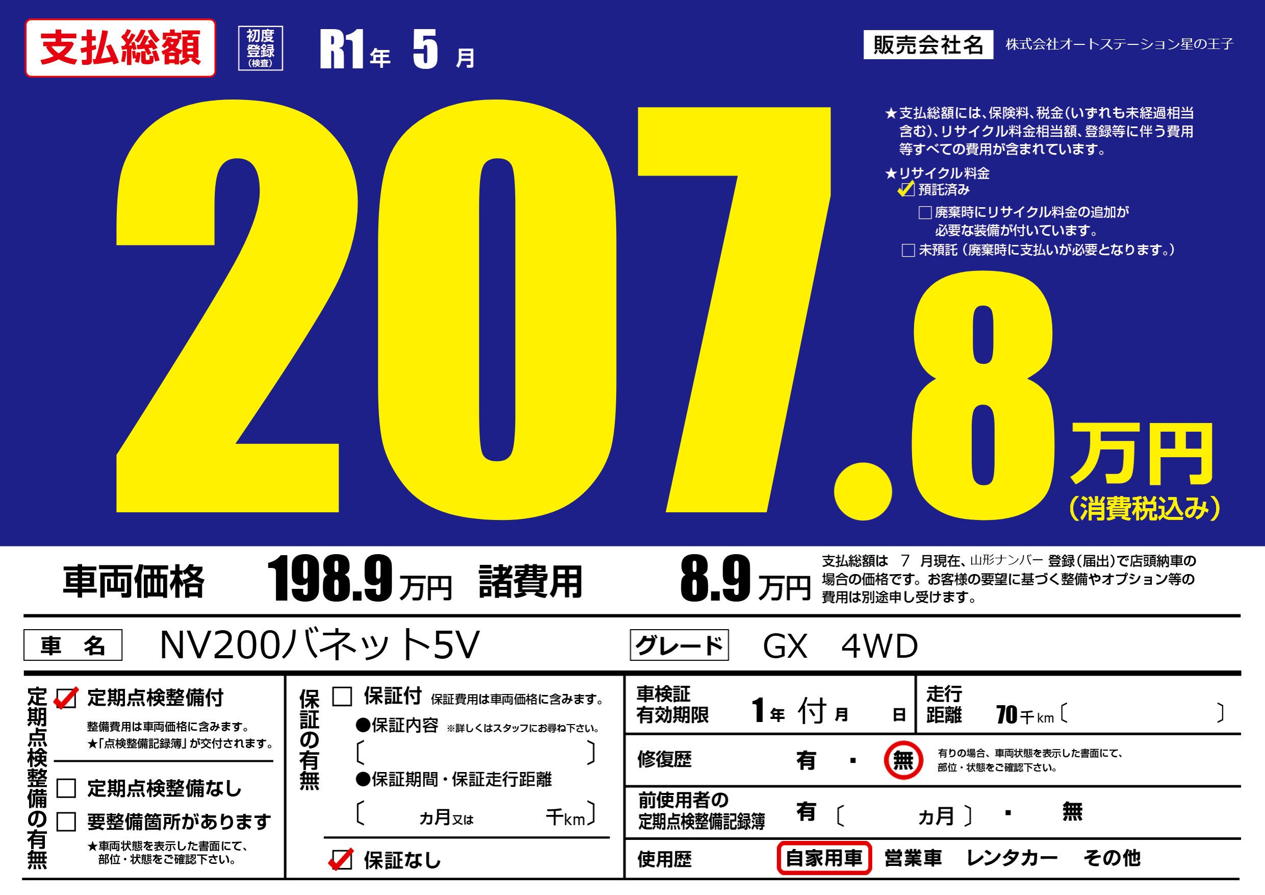 なし | 車検制限 | 1年付月---月 |