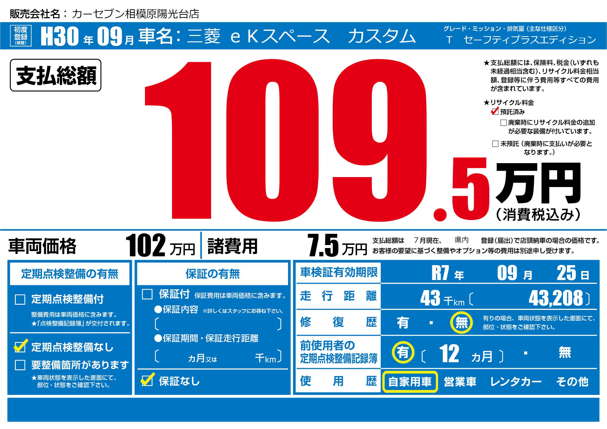 なし | 車検制限 | R7年09月25月 |