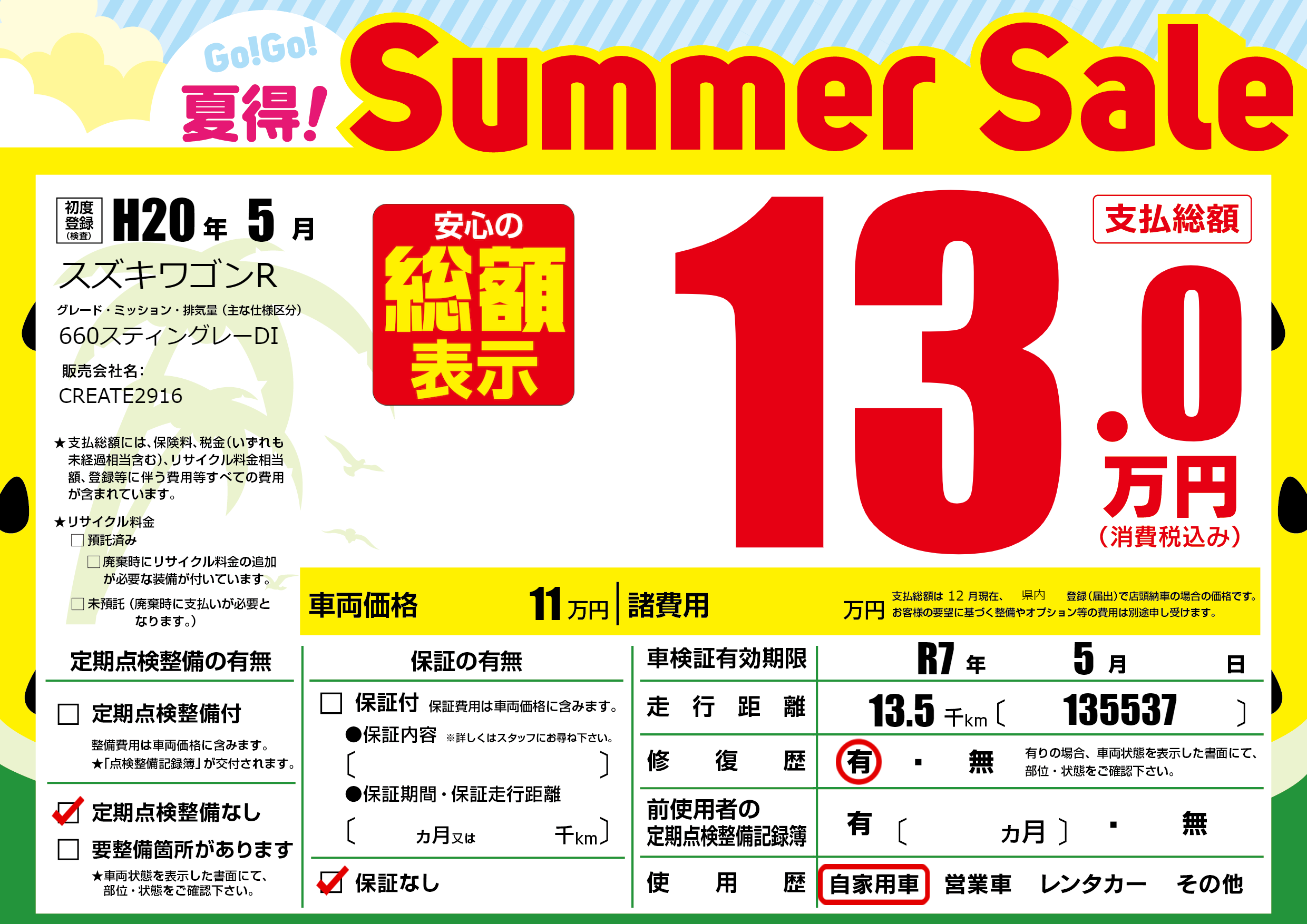 | 走行キロ | 1.3万km | 初年度登録 | H20年5月 |