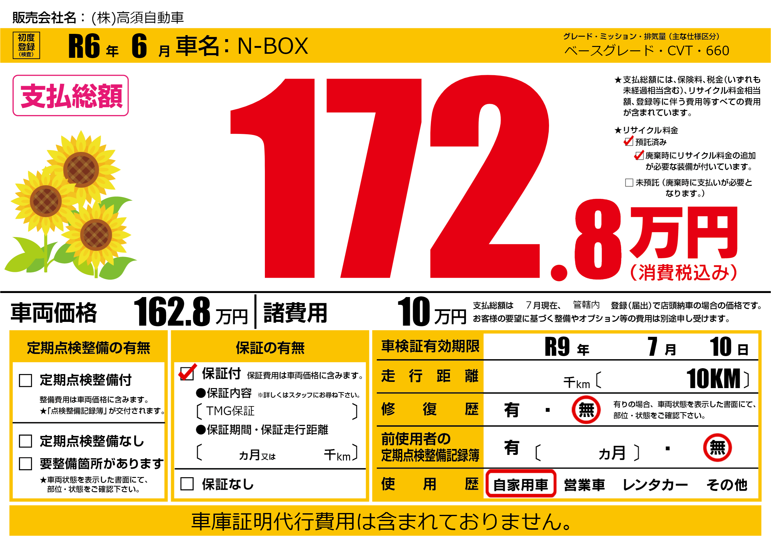 | 車名 | N-BOX | グレード ミッション 排気量 |