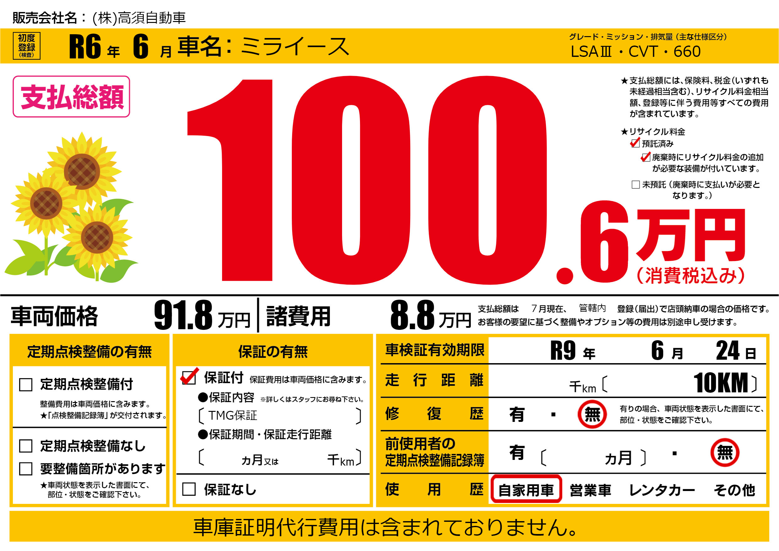 保証付き 保証内容(TMG保証) ---ヶ月または()千kmまで |