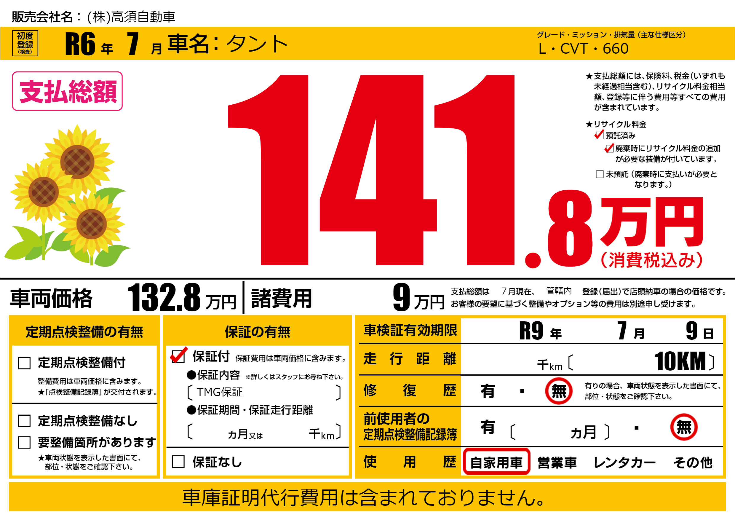 保証付き 保証内容(TMG保証) ---ヶ月または()千kmまで |