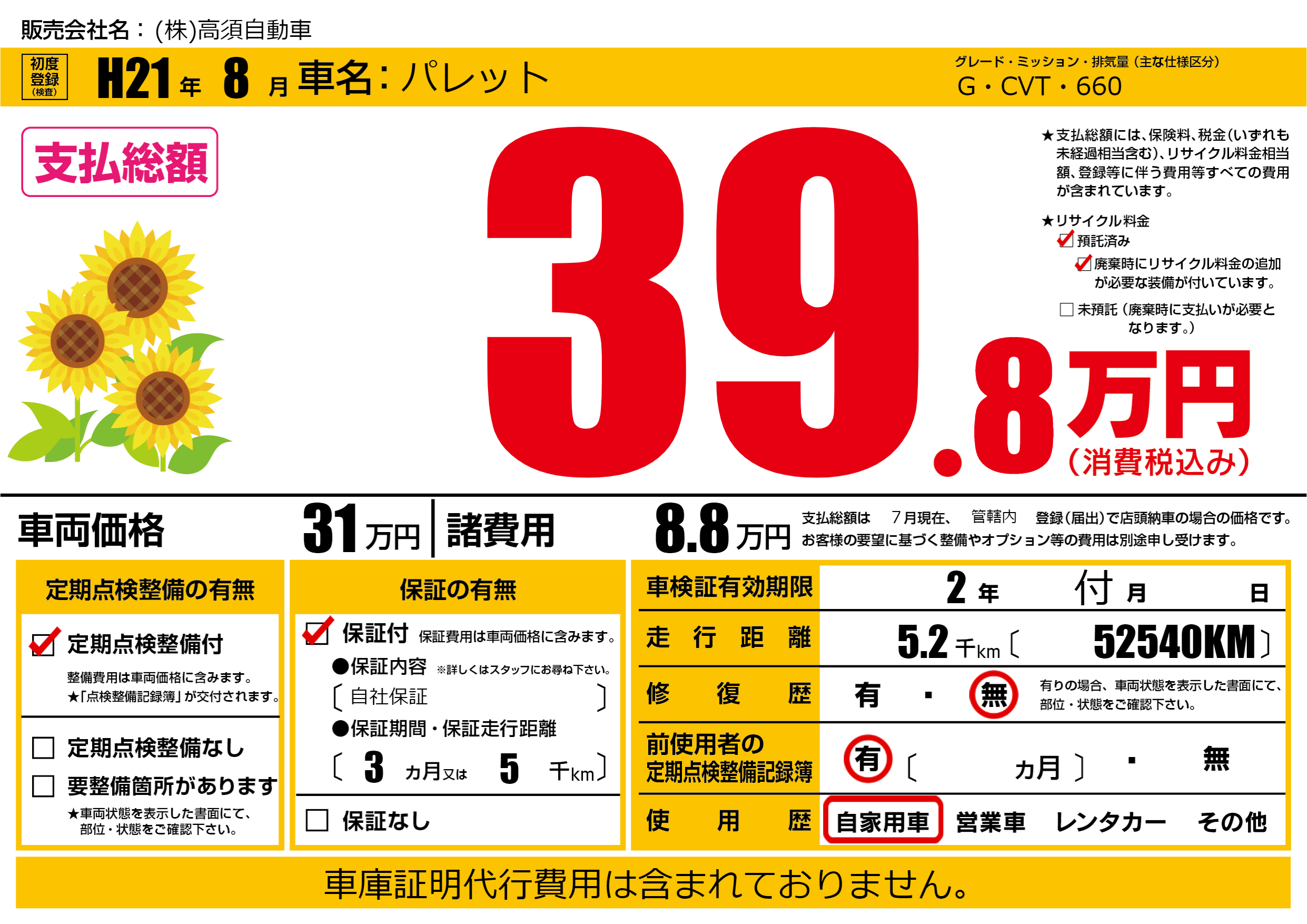 | 走行キロ | 0.5万km | 初年度登録 | H21年8月 |
