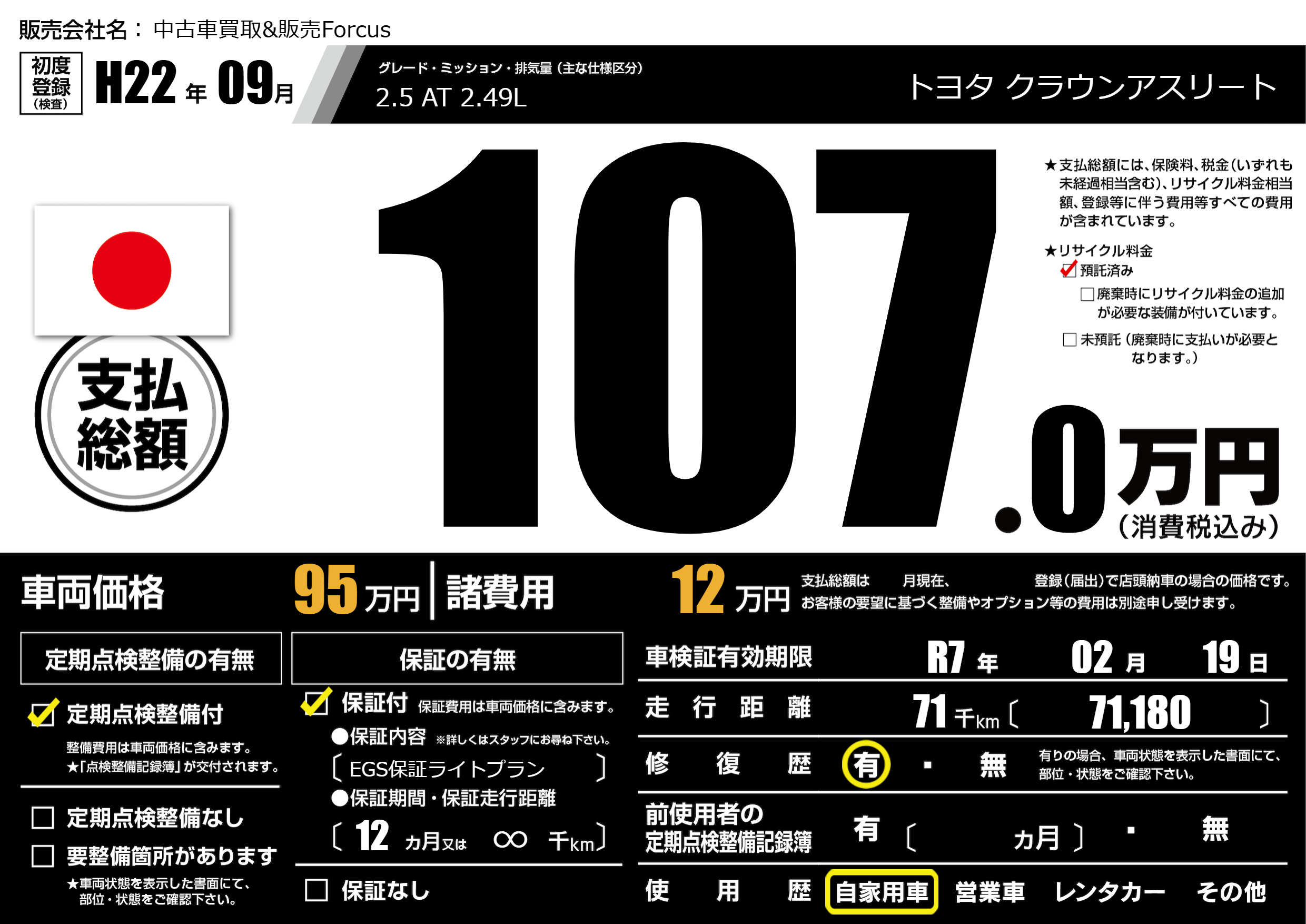 | 車名 | トヨタ クラウンアスリート | グレード ミッション 排気量 |