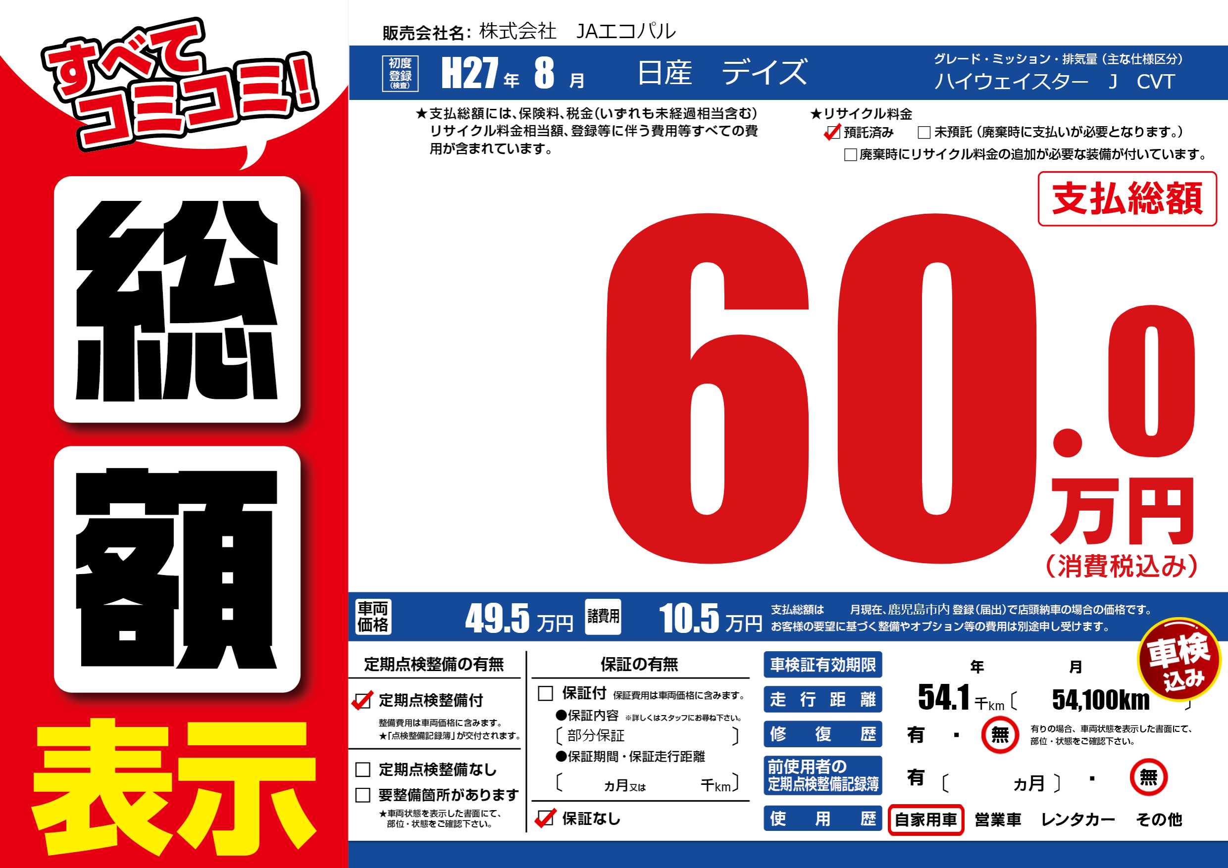 | 車名 | 日産 デイズ | グレード ミッション 排気量 |