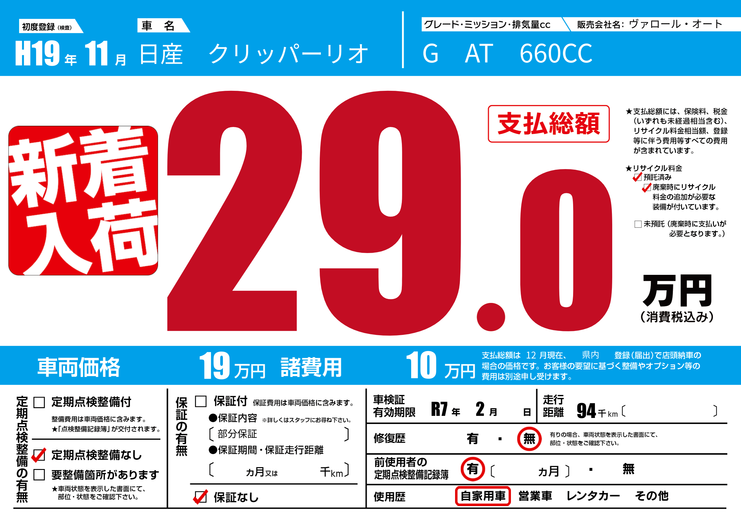 | 車名 | 日産 クリッパーリオ | グレード ミッション 排気量 |