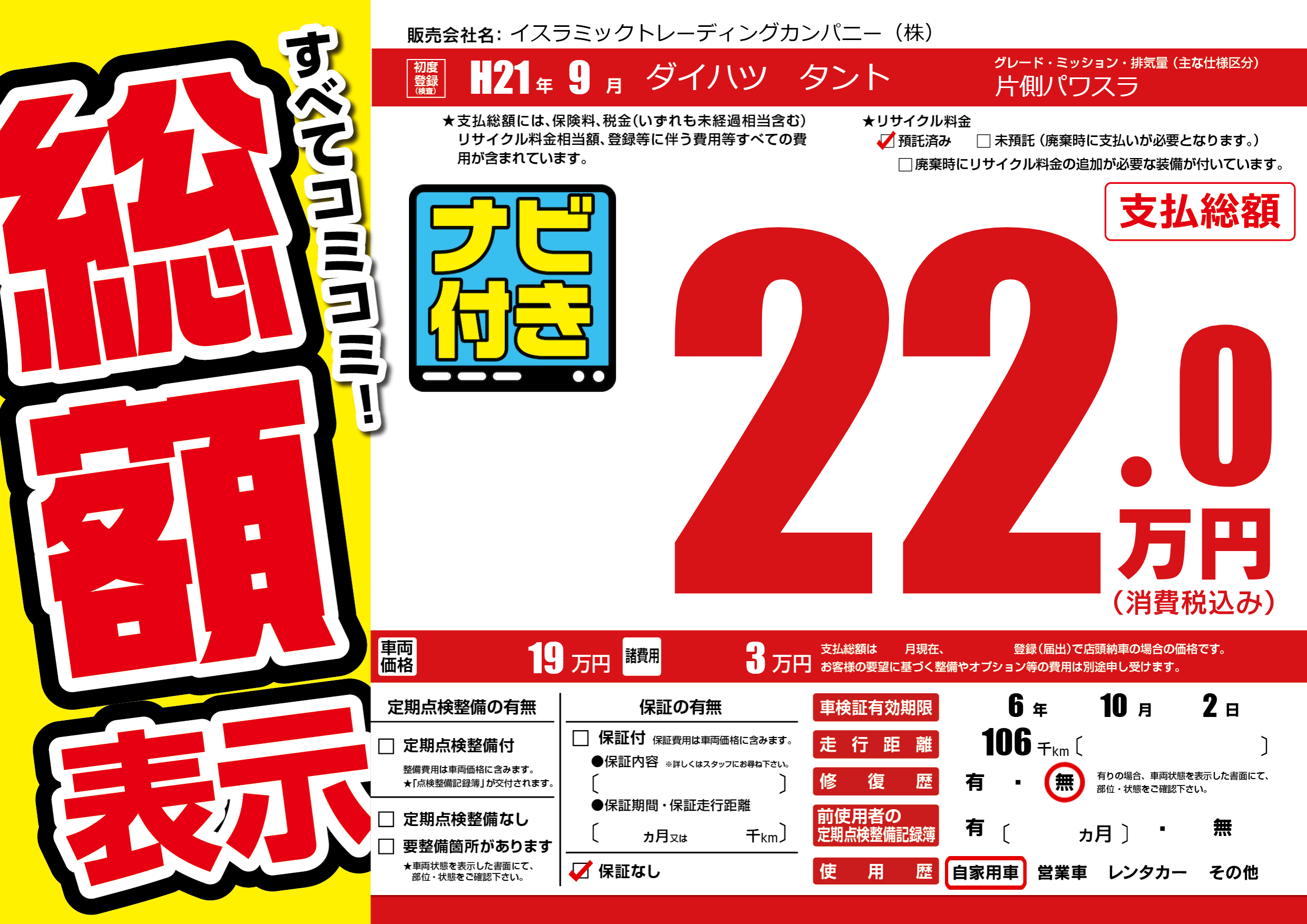 | 走行キロ | 10.6万km | 初年度登録 | H21年9月 |