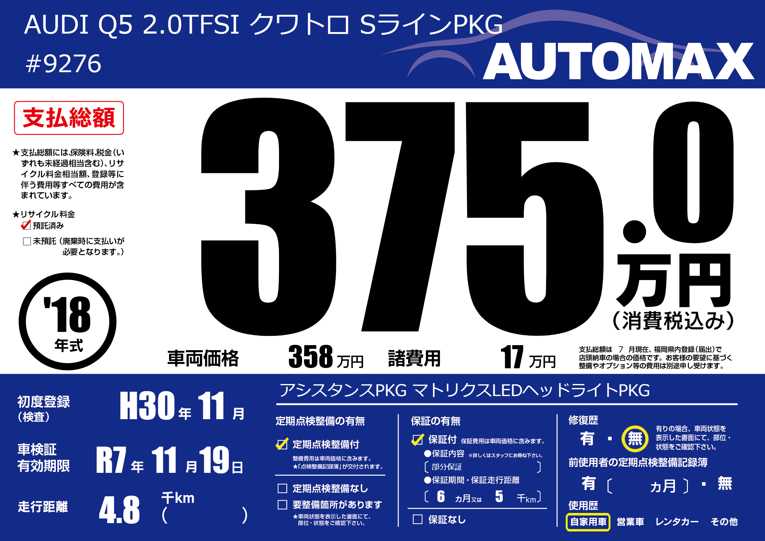 | 車名 | AUDI Q5 2.0TFSI クワトロ SラインPKG | グレード ミッション 排気量 |