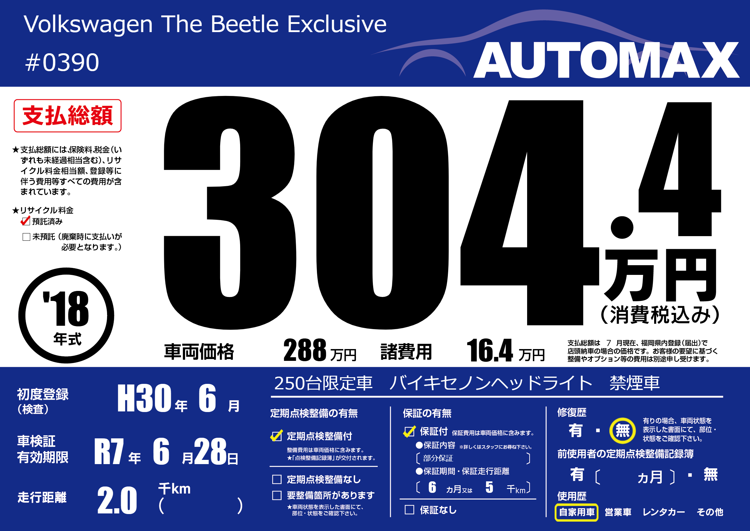 | 車名 | Volkswagen The Beetle Exclusive | グレード ミッション 排気量 |