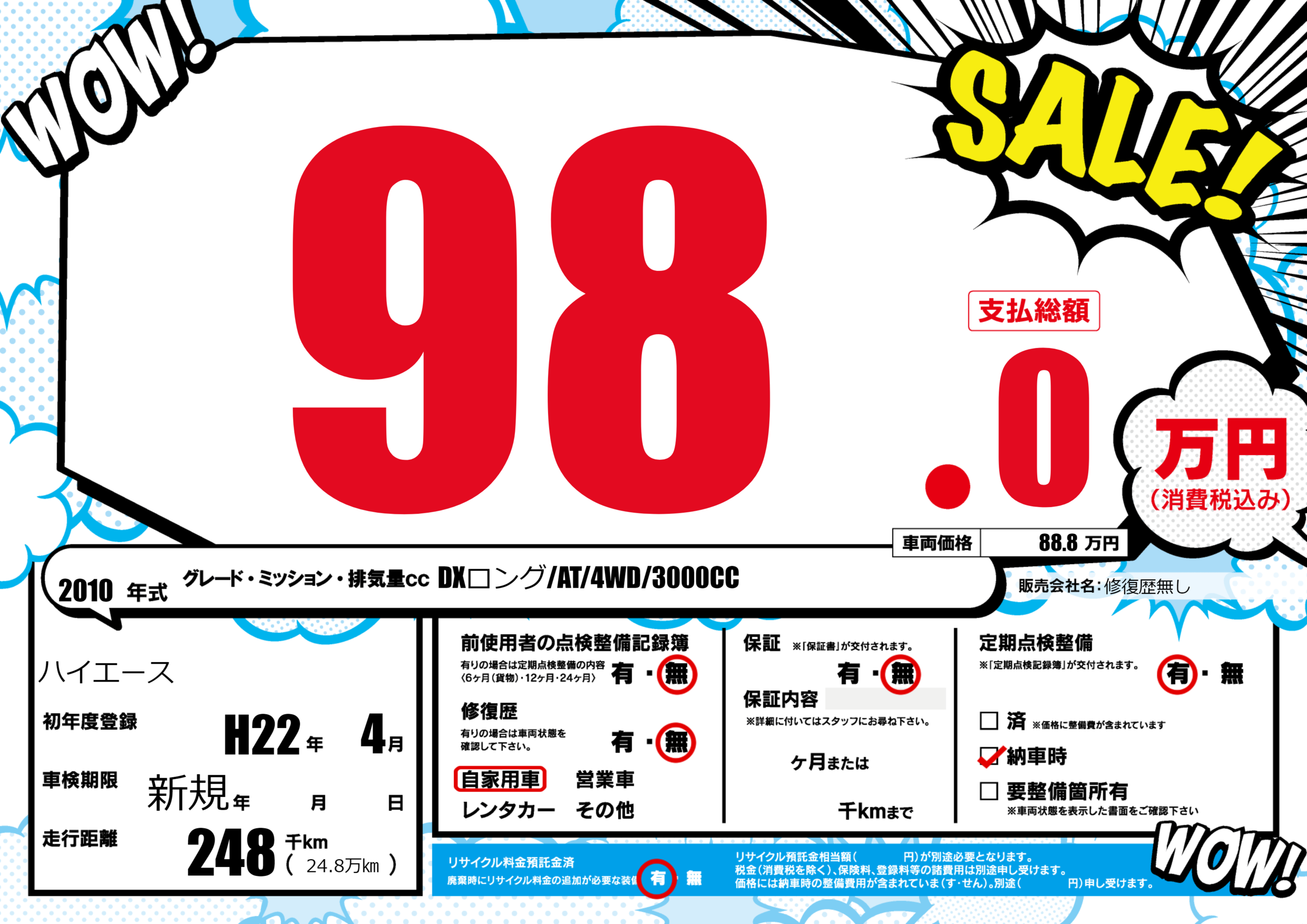 | 走行キロ | 24.8万km | 初年度登録 | H22年4月 |