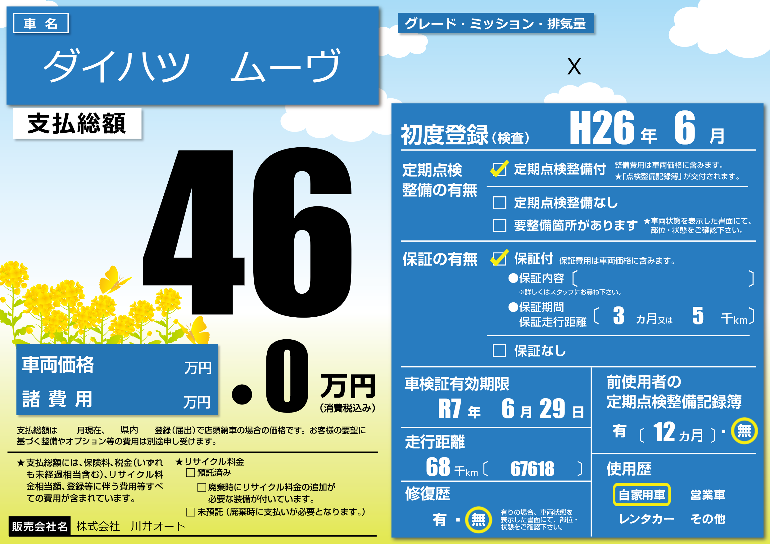 | 走行キロ | 6.8万km | 初年度登録 | H26年6月 |
