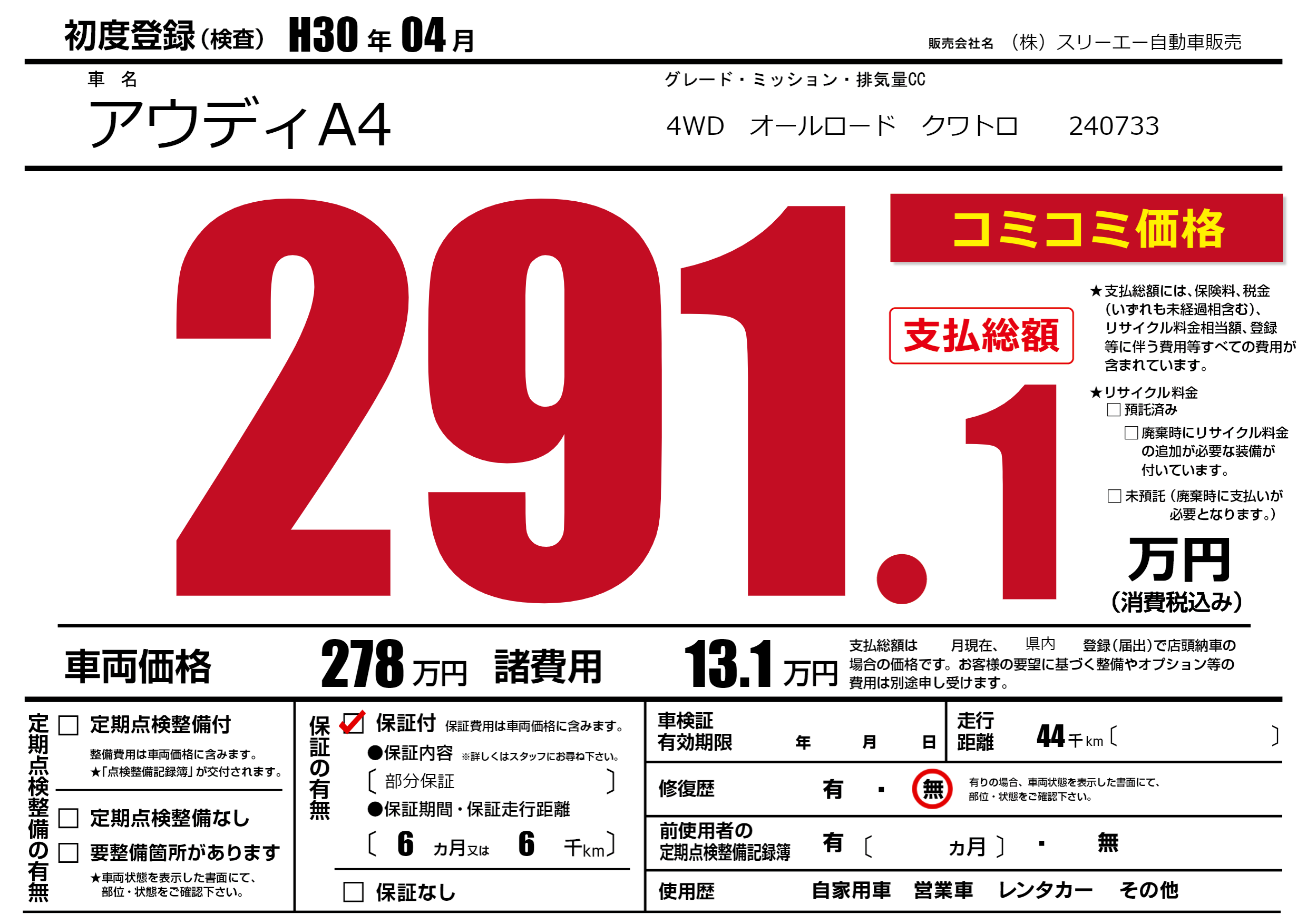 | 車名 | アウディA4 | グレード ミッション 排気量 |
